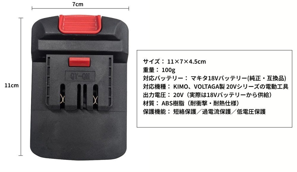 マキタ18Vバッテリーを、KIMOやVOLTAGAなどの20V電動工具で使用可能にする変換アダプターです。