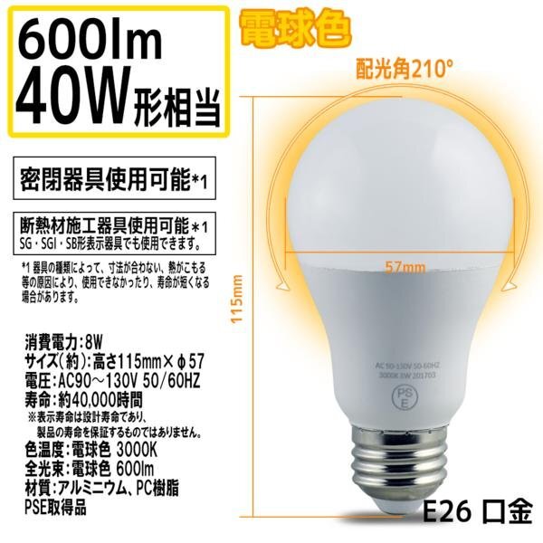 安心の1年保証付き! 口金:E26 LED電球 E26 8W ×10 |