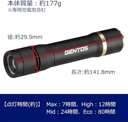 明るさ:Max/900ルーメン・High/400ルーメン・Mid/180ルーメン・Eco/50ルーメン、使用電池:専用充電池