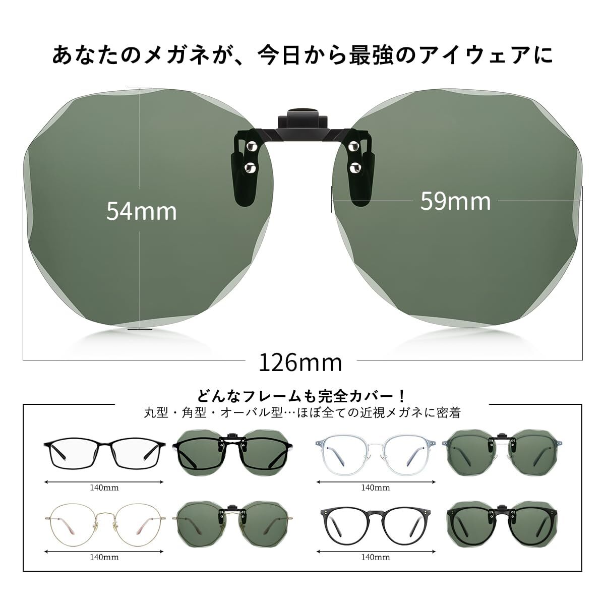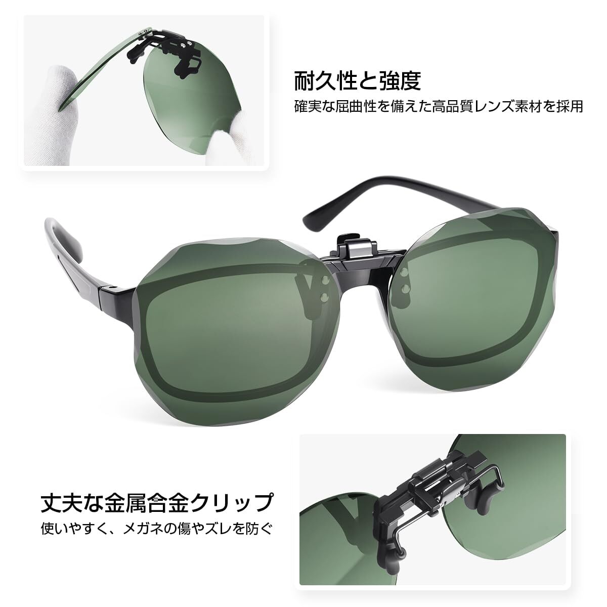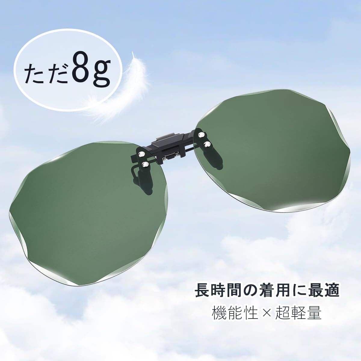 【メガネユーザー必携の便利アイテム】 わずか8gの超軽量設計で、お手持ちのメガネに簡単装着。ワンタッチで取り付け可能、跳ね上げ機能で室内外の移動もスムーズ。通常のサングラスとの付け替え不要で、快適な視界を確保します。