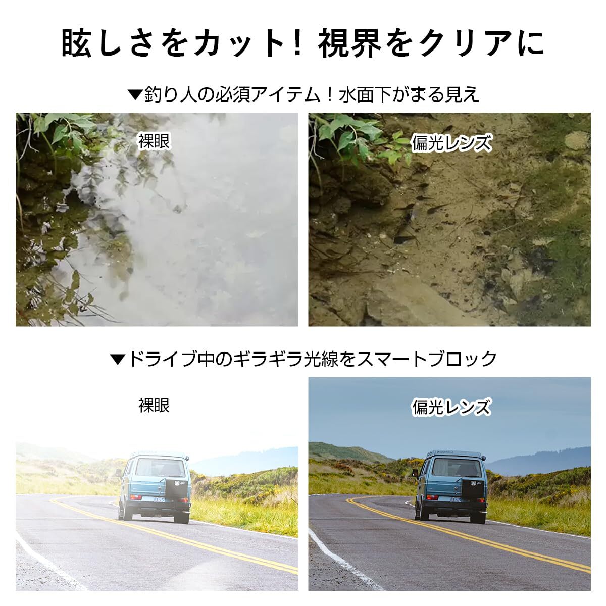 【多彩なシーンで活躍】 ドライブ、サイクリング、釣り、ゴルフなどのスポーツからハイキング、スキーまで幅広く対応。特に釣りでは水面の反射を抑え、水中の様子がより鮮明に見えます。
