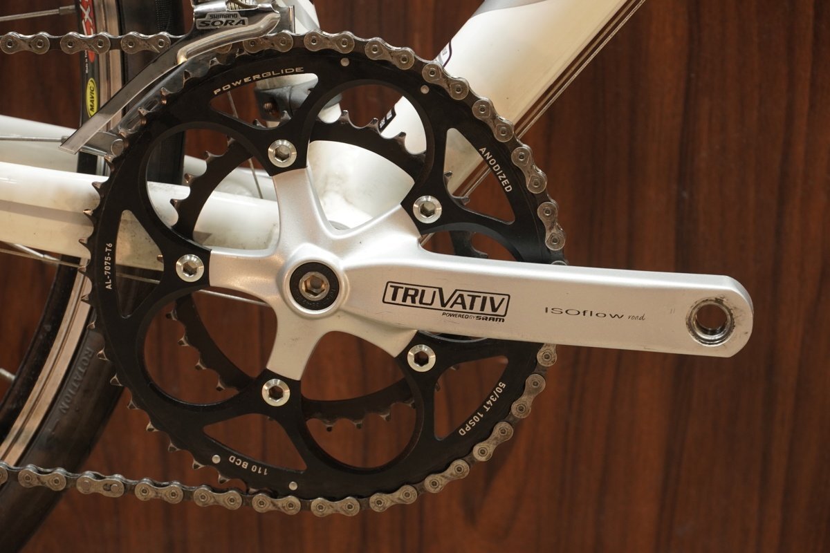| 年式:2011 フレーム:アルミ フォーク:カーボン メインコンポ:SHIMANO SORA 2X9S クランク:SRAM 165mm 50T:34T ホイール:ORIGINAL タイヤ:700 X 23 スプロケット:10T:34T ハンドル幅:360mm ステム長:70mm サイズ:44 トップチューブ長(C-C):498mm (※ホリゾンタル換算値) シートチューブ長(C-T):385mm 適応身長:155cm~165cm程度 実測重量:9.29kg ※掲載画像状態 |
