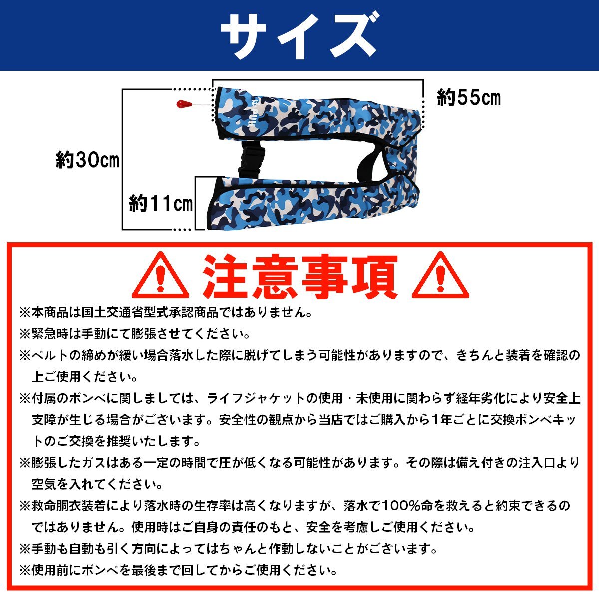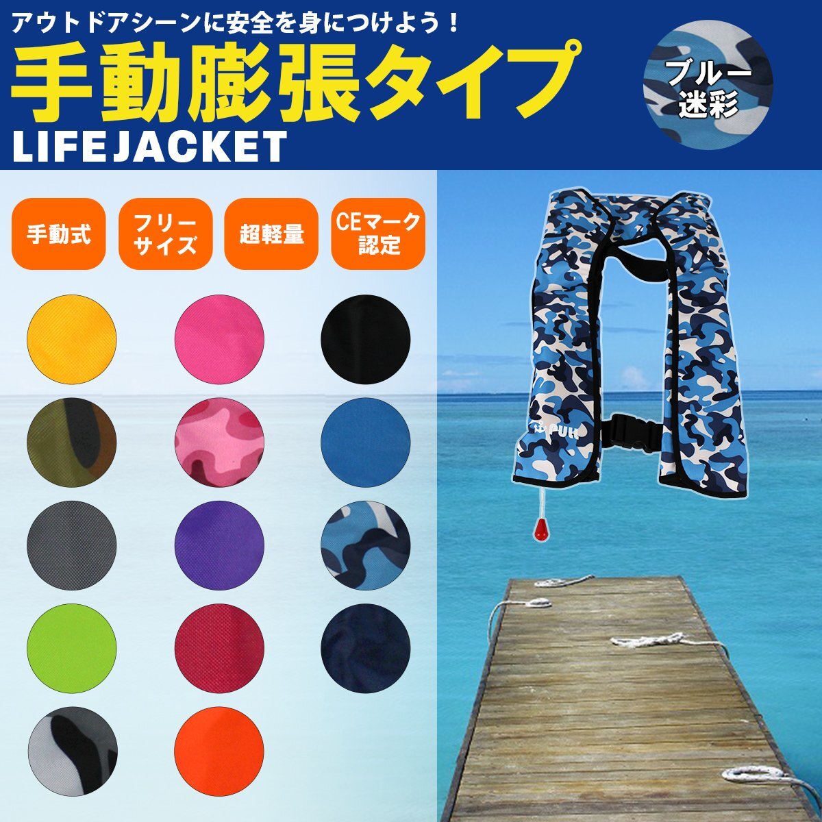 【新品即納】大人気!オリジナル ライフジャケット 手動膨張式 肩掛け ベストタイプ 迷彩ブルー※男女兼用!フリーサイズ 釣り 船 ボート