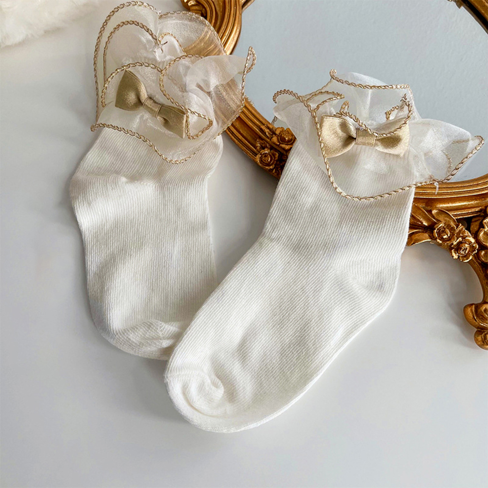 | 商品説明 | ・・ふんわりシフォン感のある女の子用 フォーマル靴下が発売。 ・程よい光沢感のリボンとゴールドのラメ糸が施されたフリルの縁が華やかなアクセントに☆ ・ガーリーなコーデにも合う女の子らしいデザインの靴下。 ・発表会や卒入園・入学式に活躍。もちろん、デイリー使いもオススメ★ |