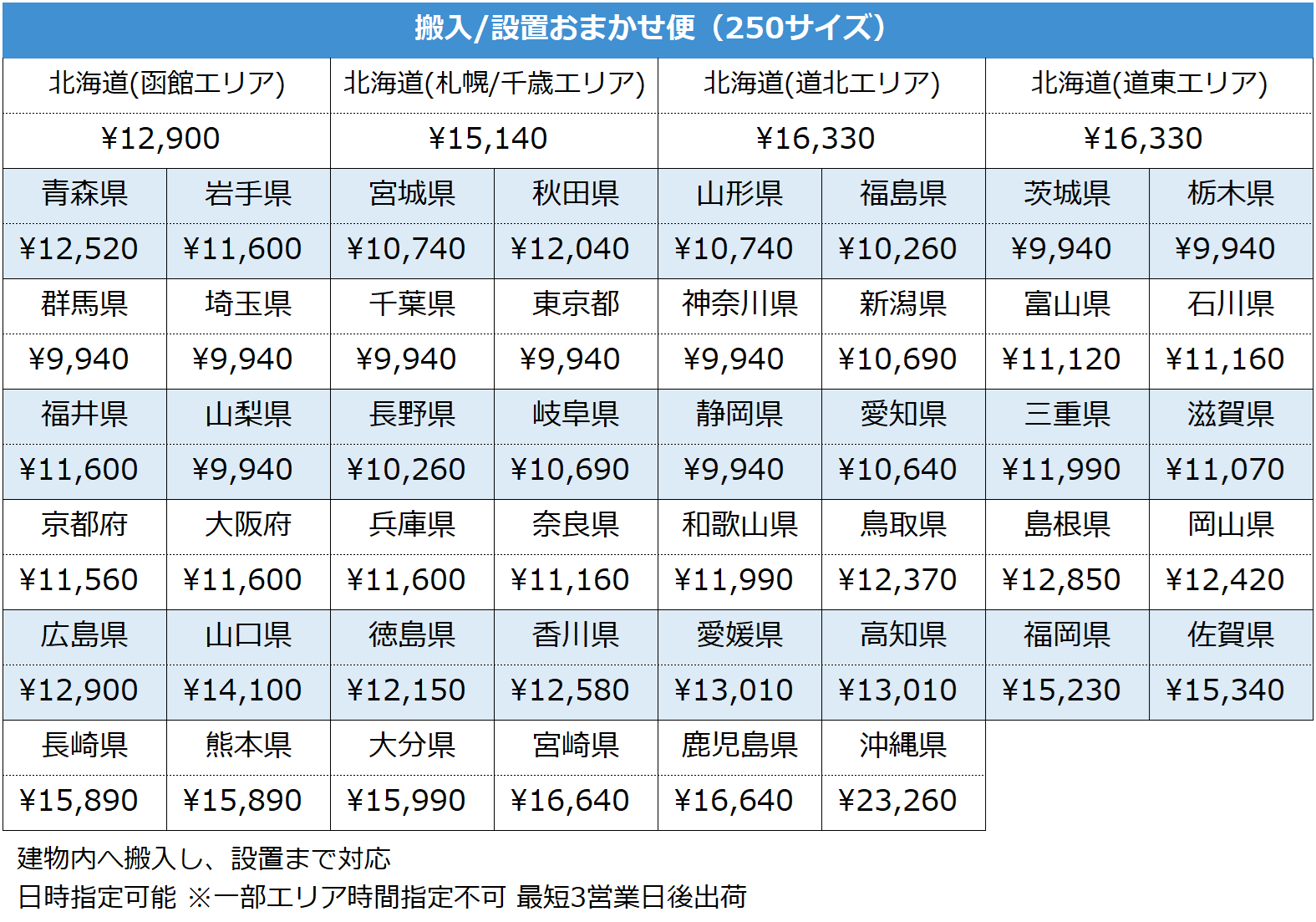 ※離島等の場合、配送可否含めて確認させていただきます。 ※同梱発送について… 同梱発送は、できる範囲で対応させて頂いております。 同梱したものが170サイズを超える荷物はそれ以外の混載便にて発送とさせて頂きます。 家具など大型商品は配送事故防止の為、同梱発送は行っておりません。 ※大量購入の場合、自社配送、トラックチャーター手配や搬入設置手配、耐震施工手配、養生手配などご相談ください。 |