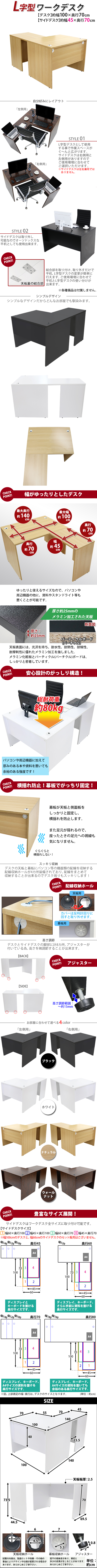 | 商品紹介 | ■作業スペースを広く確保出来る、L字型ワークデスクです。 ■サイドデスクの幅が約45cmのタイプです。 ■会議室や事務所等、オフィス家具として様々なシーンでお使いいただけます。 ■天板には、メラミン加工を施しています。 ■幕板が天板と側面板をがっちりと固定!横揺れを防止します。 ■ネジ穴隠しのシール付き。(サイドデスクのみ付属) ■デスクの天板と幕板に配線収納ホールが2カ所ずつ備わっています。 ■アジャスターで高さの調節が可能です。(高さ調節範囲〜約15mm) ※こちらの商品は、組立て式です。組立てにはプラスドライバーが必要です。お客様でご用意ください。 ※組立図が付属します。 ※サイドデスクの取り付けはデスクの右側専用となります。 ■材質:パーティクル(パーチクル)ボード(メラミン加工)(本体、サイドデスク)、プラスチック(アジャスター、配線収納ホール) ■重量:約41kg(デスク:約28kg、サイドデスク:約13kg) ■総耐荷重:約80kg ●新品商品ではありますが、輸入商品の為、多少の擦り傷などがある場合がございますので、ご納得の上ご購入下さいませ。 ●ご購入後、お客様ご都合によるご返品、ご返金等は一切お受け致しておりません。 ●本商品を使用した際に発生したトラブル、事故につきまして、当社は一切の責任を負いません。ご使用に関しましては、全て自己責任にてお願い致します。 ※カラーはナチュラルとなります。 |