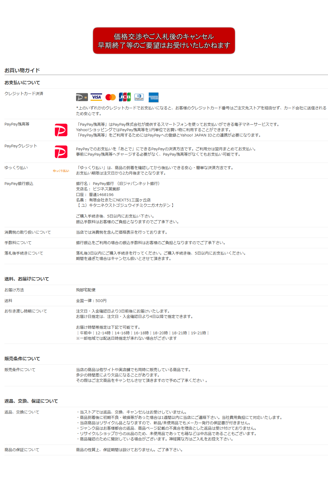| 入札後のキャンセル・返品・返金は一切お断りさせて頂きます トラブル防止の為、疑問点に関しては必ずご入札前にご質問下さい | |