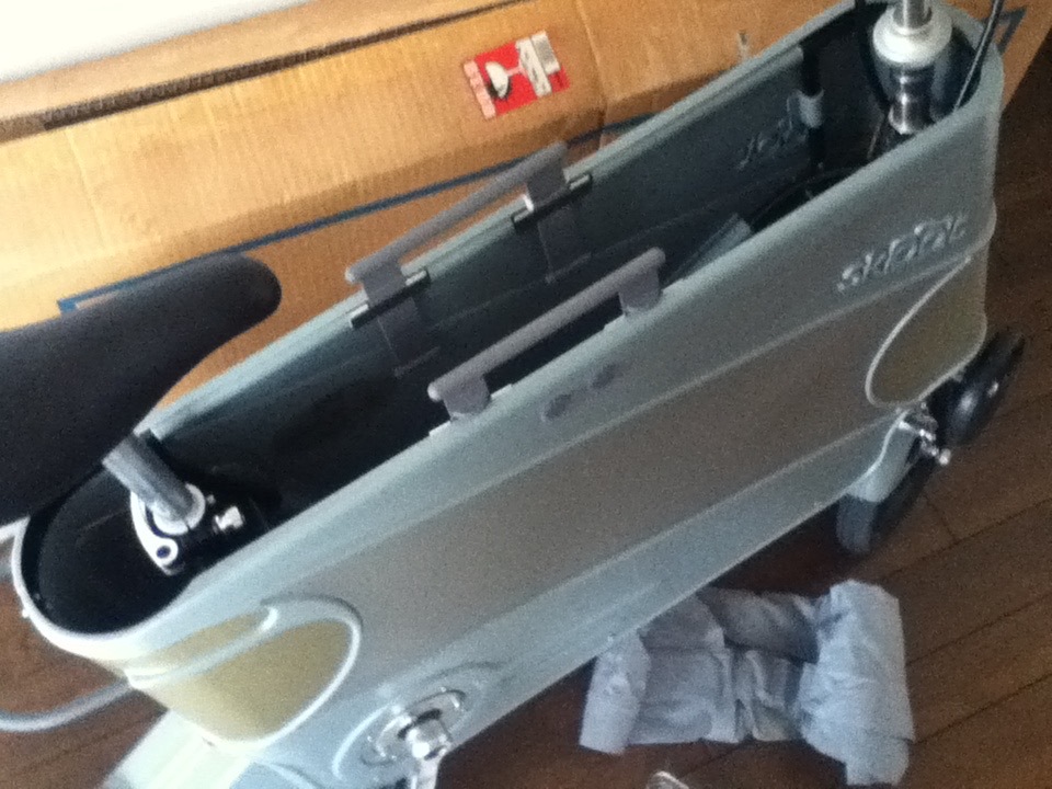 ◎商品受取完了手続きが受取当日中にできない方は入札しないで下さい。箱サイズ約68×95×19cm。2001年イギリス製スーツケース型折りたたみ自転車。いつか乗ろうと湿気のない暗所(部屋)で保管していました。工場出荷時の状態と思います。カタログ、説明書付(英語)。コンパクトなスーツケース型でコロコロ引いて移動できますが重量は14kgくらいあるので持ち上げるにはそれなりのパワーが必要です。タイヤの空気が抜けていたので付属の空気ポンプにてある程度の空気を入れています。前後ポジションライトは電池液漏れ対策に抜いて保管で今回確認したところ問題なく点灯していますが、単4電池各2個はご用意ください。問題ないと思いますが24年前の自転車なので乗る前にプロに点検してもらってください。発送はヤマトに持ち込み仕事が休みの日になるので即発送はできません。程度 未使用(大きさ比較のライターを除き写真のモノが全てです。あくまで個人保管品であることをご理解ください。神経質な方の入札はご遠慮下さい。)●他にも多数出品しています。*評価不要の方がいらっしゃるのでこちらこら評価しません(評価いただいた方のみ評価いたします)。*発送において万一の輸送事故等の責任は当方では負いかねます。*土日祝日は近所の郵便局が休みなので休み明け発送になる場合もあります。*オークション終了後に梱包するので実際の送料が若干違ってくることがあります。*事前にお気軽にご質問ください。*ノークレーム・ノーリターンとさせていただきます。*落札後24時間以内に連絡いただけ、48時間以内の入金ができる方のみ入札ください。(所用により時間が守れなくなった方はとにかく連絡ください。連絡もなき場合こちらの判断で削除します。)*トラブルを避けたいため評価の悪い方はこちらで削除し、未取引でもブラックリストに入れる場合があります。どうしてもと言う方はまず質問欄から連絡ください。*約束が守れない無責任な落札者さんはブラックリストに登録し、今後一切のお取り引きをご遠慮させていただきます。