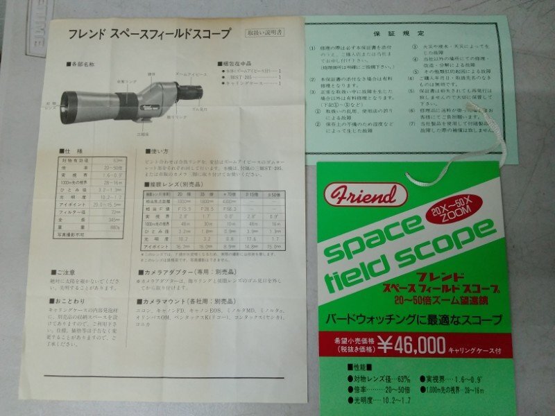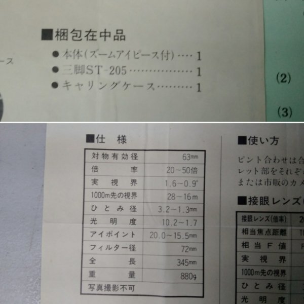 状態は使用品となり、擦り傷・汚れ・塗装剥がれ・ アイピースの先端に少し変色などありますが、 全体的には、目立ったダメージはありません。 キャリングケースの金具に錆が見られます。 取扱説明書(変色あり)あり。付属品は全てあります。 |