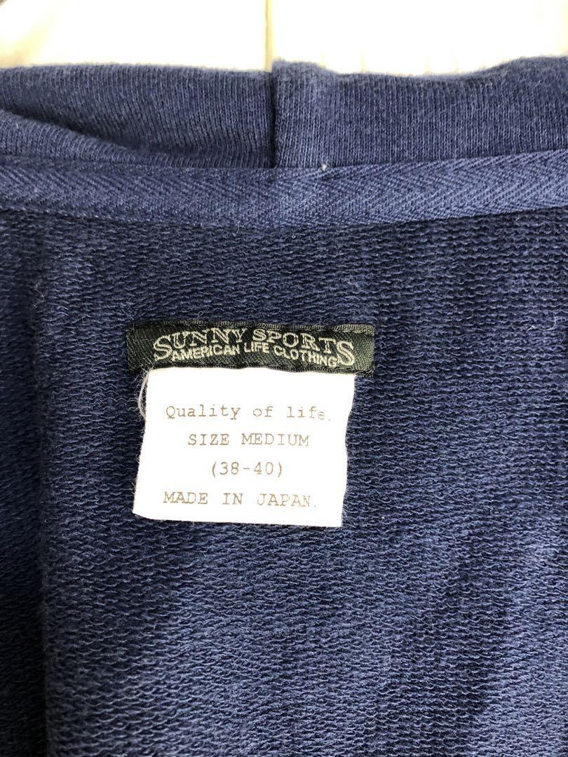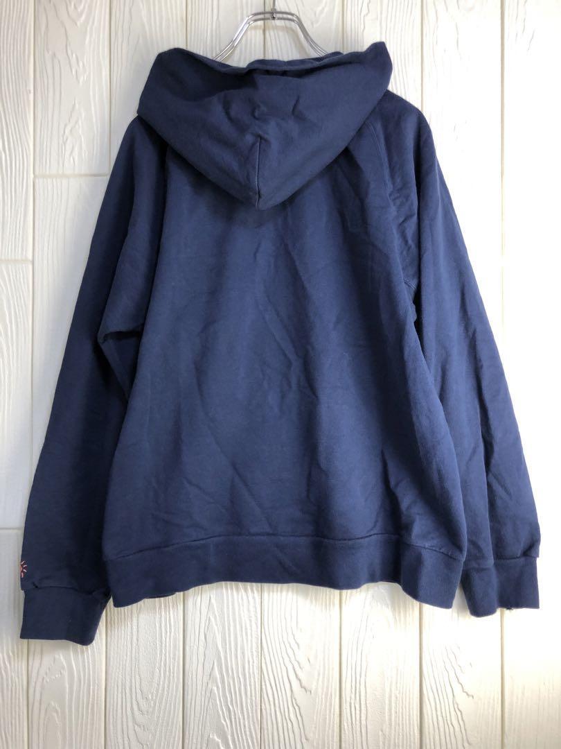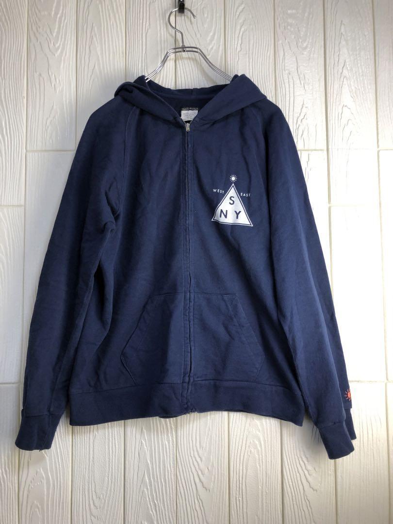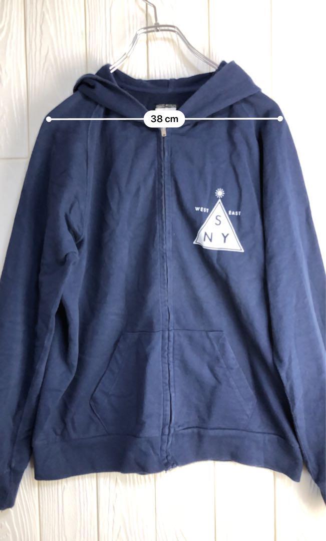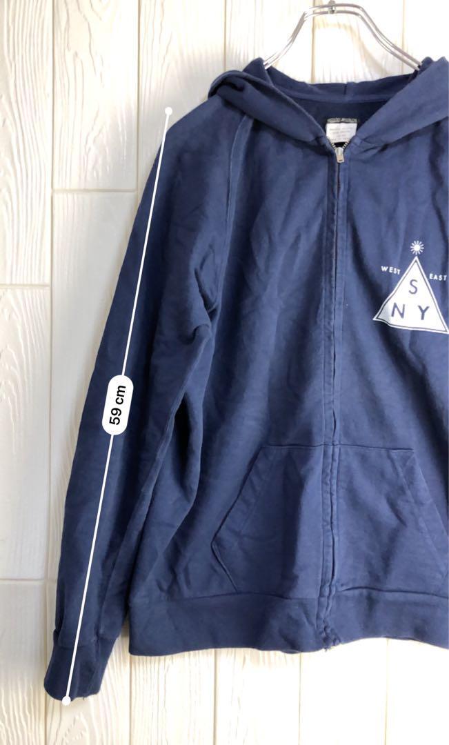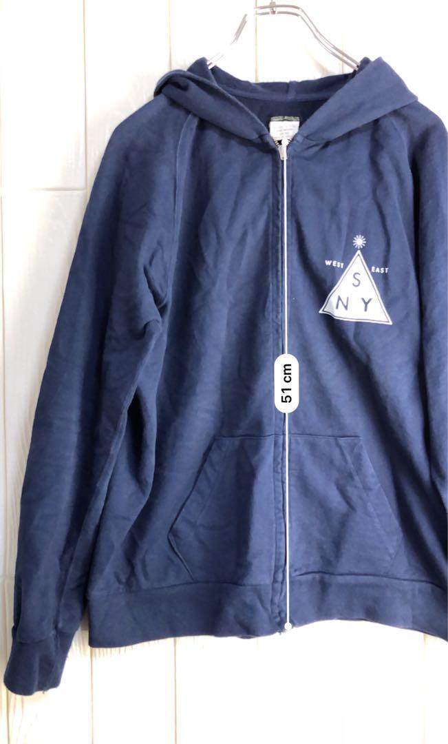 ネイビーのフルジップパーカー、シンプルなデザインで使いやすい。