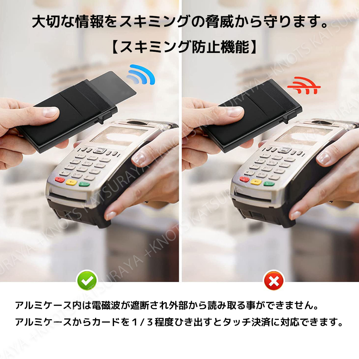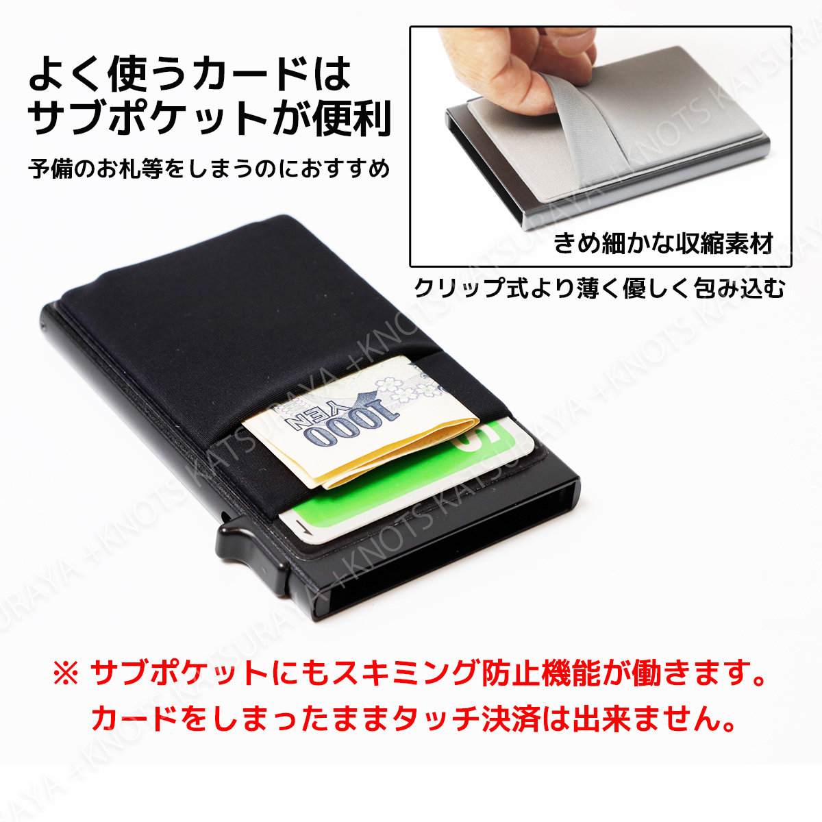 カードの取り出しレバーを側面に移動したことで片手操作が可能になり、ポケットから取り出すのと同時にカードがスライドできます。収納は押し込むだけでいつもスマートに。大切な情報を守るスキミング防止機能、アルミケースはでは折り曲げや圧迫からもカードを守ります。