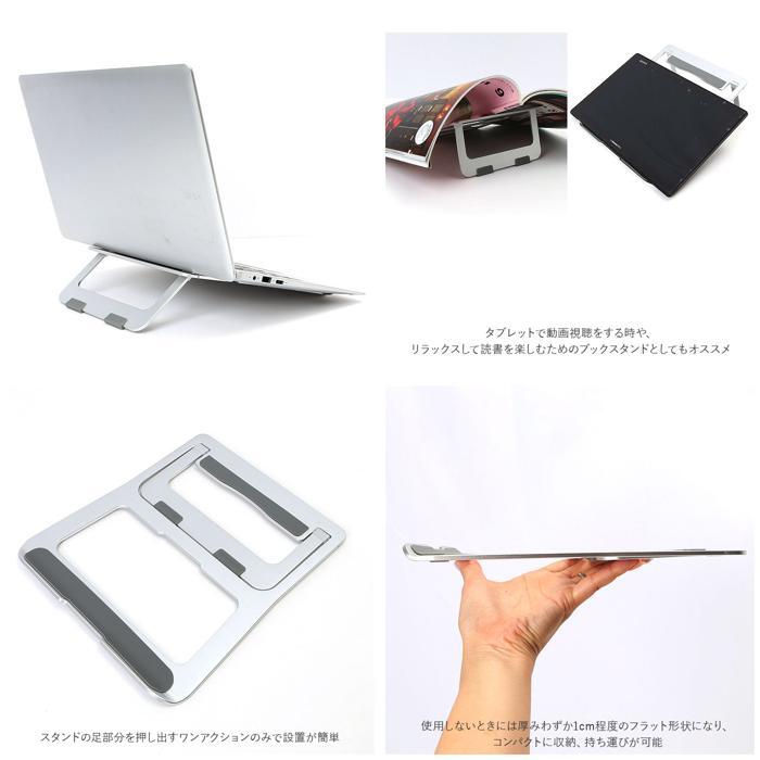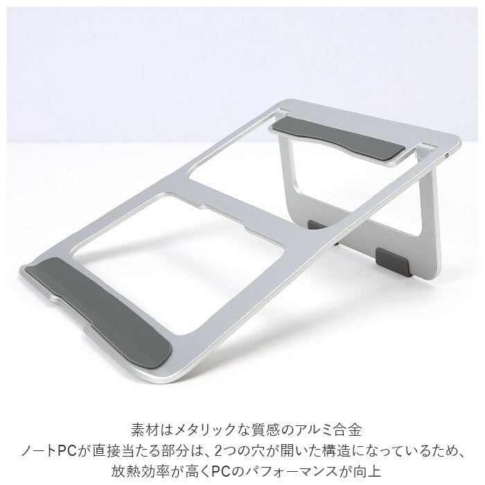 | 商品説明 | ・・姿勢に負担をかけず、お仕事もネットサーフィンも快適に。シンプルなノートパソコンスタンドが新登場! ・テレワーク作業時などに肩や腰に負担のかからない、程よい目線の高さにノートPCをセッティングできるノートPC用スタンド。 ・スタンドの足部分を押し出すワンアクションのみで設置が簡単。 ・パソコン設置面の上下に、ノートPC本体をしっかりホールドするシリコンパッドを装着し、大切なPC筐体にも傷をつけにくい安心仕様。 ・素材はメタリックな質感のアルミ合金。ノートPCが直接当たる部分は、大きく2つの穴が開いた構造になっているため、放熱効率が高くPCのパフォーマンスが向上。 ・スタンド足部分にもシリコンゴム加工を施し、タイピング作業時にスタンドごとPCがズレていくことがないので、お仕事や作業がスムーズ。 ・使用しないときには厚みわずか1cm程度のフラット形状になり、コンパクトに収納、持ち運びが可能。 ・タブレットで動画視聴をする時や、リラックスして読書を楽しむためのブックスタンドとしてもオススメ。 |