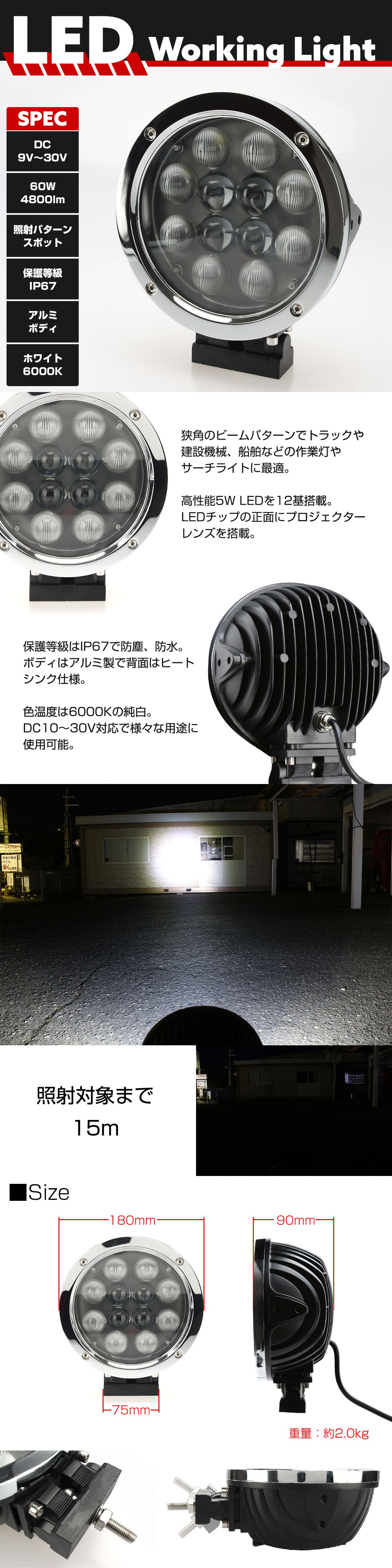 ■商品コード PZ367 ■商品タイトル LED サーチライト 60W ■特徴 狭角のビームパターンでトラックや建設機械、 船舶などの作業灯やサーチライトに最適。 高性能5W LEDを12基搭載。 LEDチップの正面にプロジェクターレンズを搭載。 保護等級はIP67で防塵、防水。 ボディはアルミ製で背面はヒートシンク仕様。 色温度は6000Kの純白。 DC10?30V対応で様々な用途に使用可能。 ■商品内容 ・動作電圧:DC9V?DC30V ・照射パターン:スポット (30度) ・保護等級:IP67 ・LED:5W×12基 ・光束:4800lm ・色温度:6000K ・サイズ:画像に掲載 ■その他作業灯はコチラ |