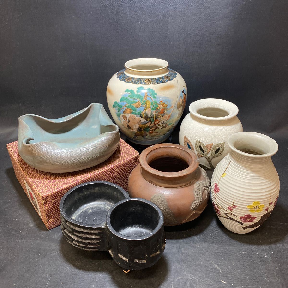 N 5912 [ 花器 6点 まとめて ] 九谷焼 七福神 フラワーベース 漆器 陶器製 高台 水盤 壺 花生け 花入れ 花活け 茶道具 花瓶 現状品です。