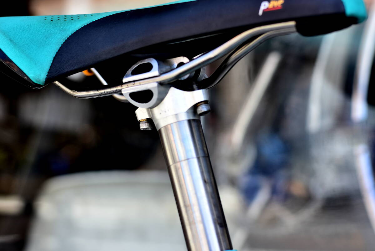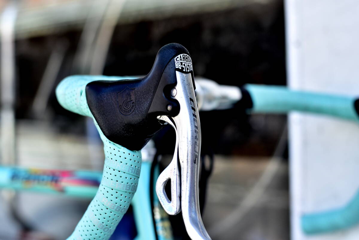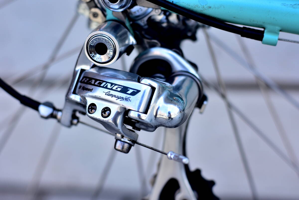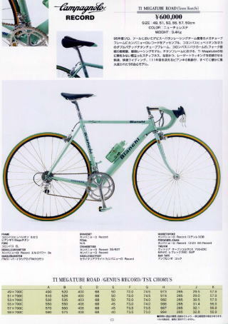 フレーム:BIANCHI トップチューブC-C 550 シートチューブ C-C 550 ヘッド:Campagnolo Record ハンドル:Cinelli NERVE シートポスト:PMP Titanium サドル:FIZIK PAVE クランク:Campagnolo Chorus Triple ペダル:LOOK フロント・ディレイラー:Campagnolo Racing triple 3s リア・ディレイラー:Campagnolo Racing tripre 9s エルゴパワー:Campagnolo Chorus 9s ブレーキキャリパー:Campagnolo Chorus ハブ:Campagnolo リム:Wolber (Tu) |
