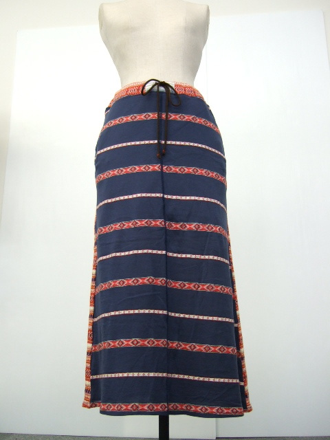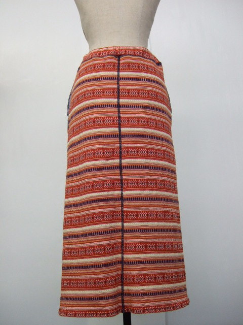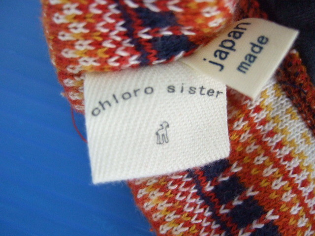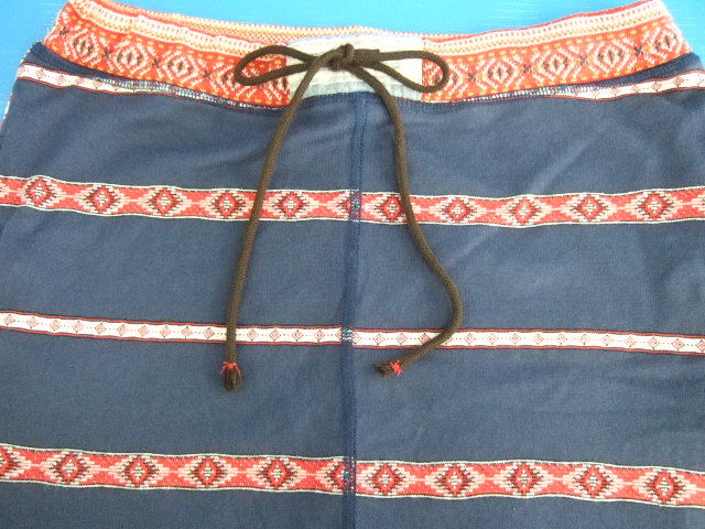 前身頃は青地にチロリアンテープ模様、後身頃は赤地の模様編みと