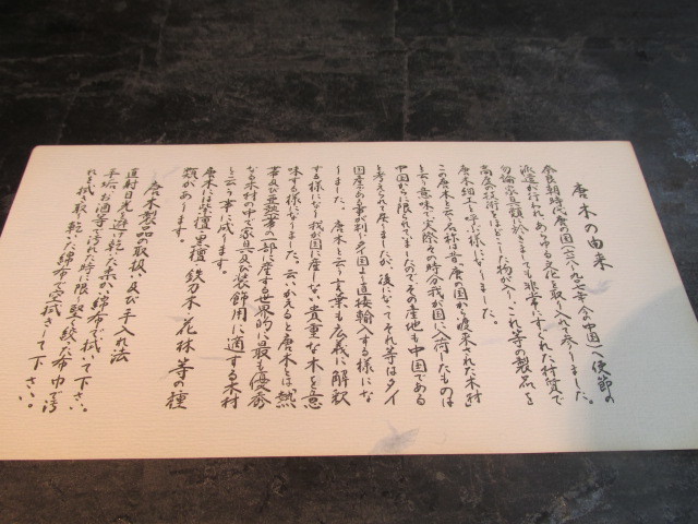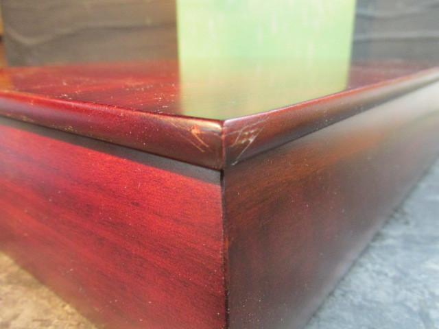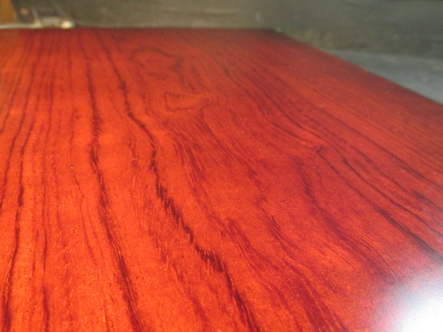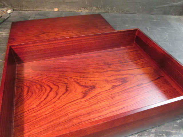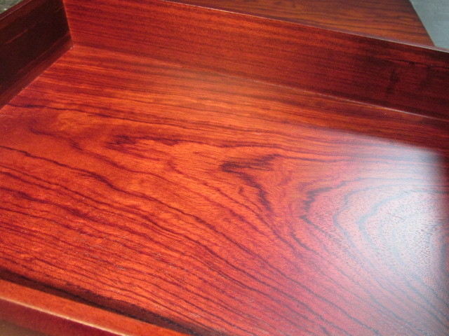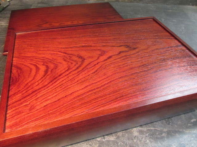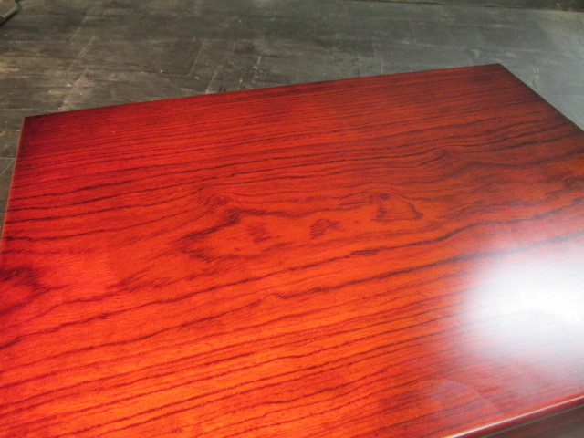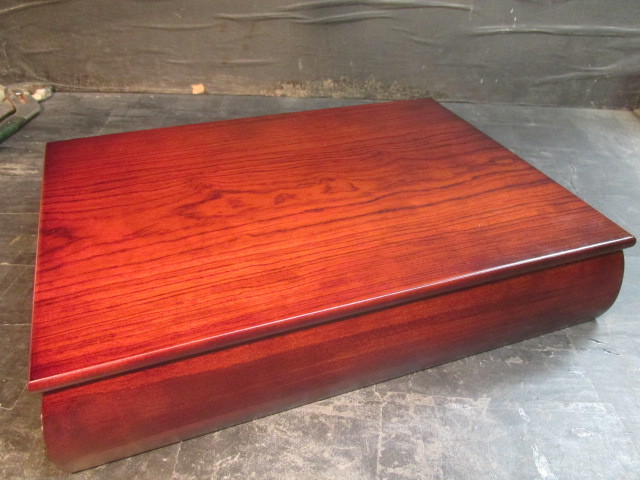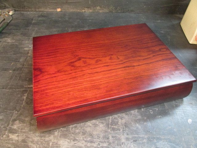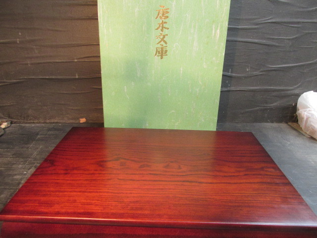 ここに紹介した紫檀文庫は大阪の伝統工芸品として有名な大阪唐木指物家具の紫檀文庫です。大阪唐木指物家具というのはベトナム辺りの東南アジアの紫檀を使って伝統工芸の指物技法を使って一品一品手作りで作り上げる家具類です。この文庫は紫檀の一枚板の色、艶などはやはり特別な高級紫檀を贅沢に使った仕上げとなっています。なお、上蓋の一つの角に小さな傷があります。