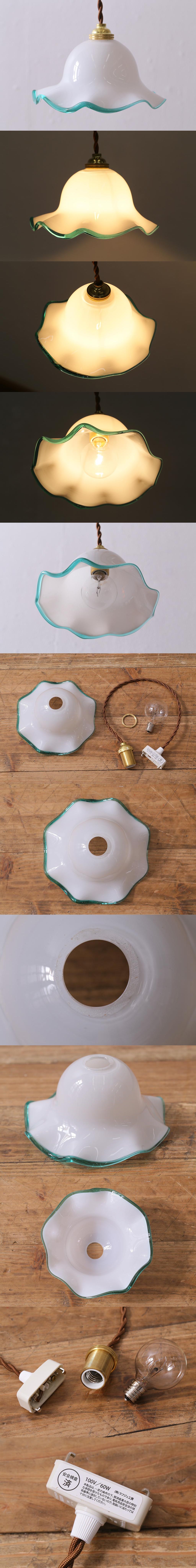 R-040809 ヴィンテージ照明 イギリスビンテージ 小振りな水色縁フリルのミルクガラスペンダントライト(ランプシェード、天井照明)