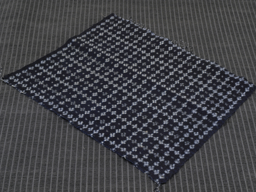 濃藍(こいあい)色の地に、絣で四つ玉の文様が織り込まれた、綿絣のはぎれです。 昭和初期ごろにつくられたと思われるアンティークのお品です。うすよごれやくすみ、ムラなどはありますが、そのほかに目につくしみやよごれ、褪色などのダメージは見あたらず、この時代のものとしては、たいへんきれいな状態です。 |