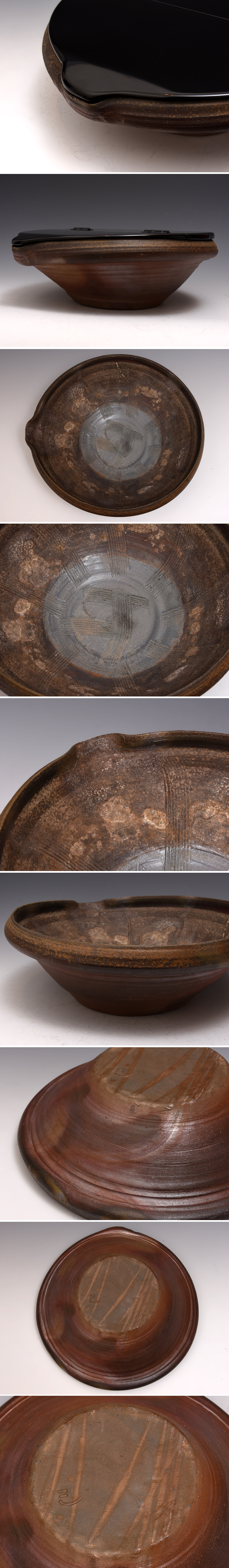 各見飛出記(造)備前焼摺鉢水指です。 引き締まった備前の肌、釉薬とのバランスの景色が素晴らしく、 摺鉢形ですが水指としてもお使い頂けるよう 天然木木地に本漆が施された誂え蓋が付属しております。 高台底に銘あり。 美品ですのでキズ等なく良い状態です。 |