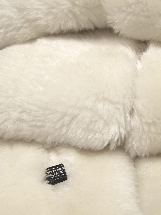 全体的な印象としてはアイボリーホワイトといった感じのフェイクファーショールです。繊維メーカー「旭化成」さんの製品で、裏地に旭化成さんのロゴの入ったタグが付いています。 ユーズド品で、画像のとおり、裏綿の左後首付近に長さ約 5-20cm のうすよごれが 2、3 か所あります。そのほかに目につく大きなしみやよごれ、褪色などのダメージはなく、 お手入れしていただければきれいになりそうですが、状態ランク=「D」のご着用対象外、リメイク素材用とさせていただきます。 |