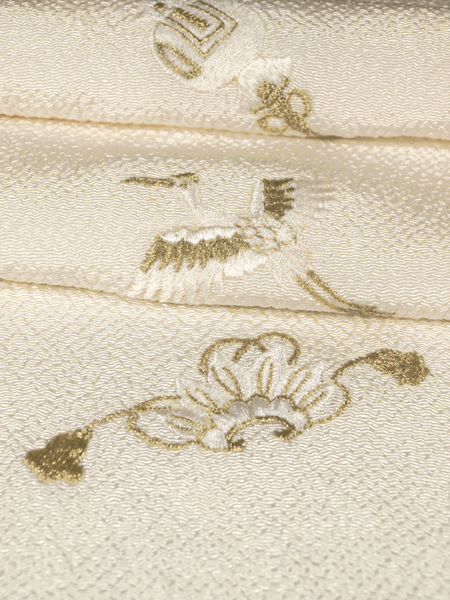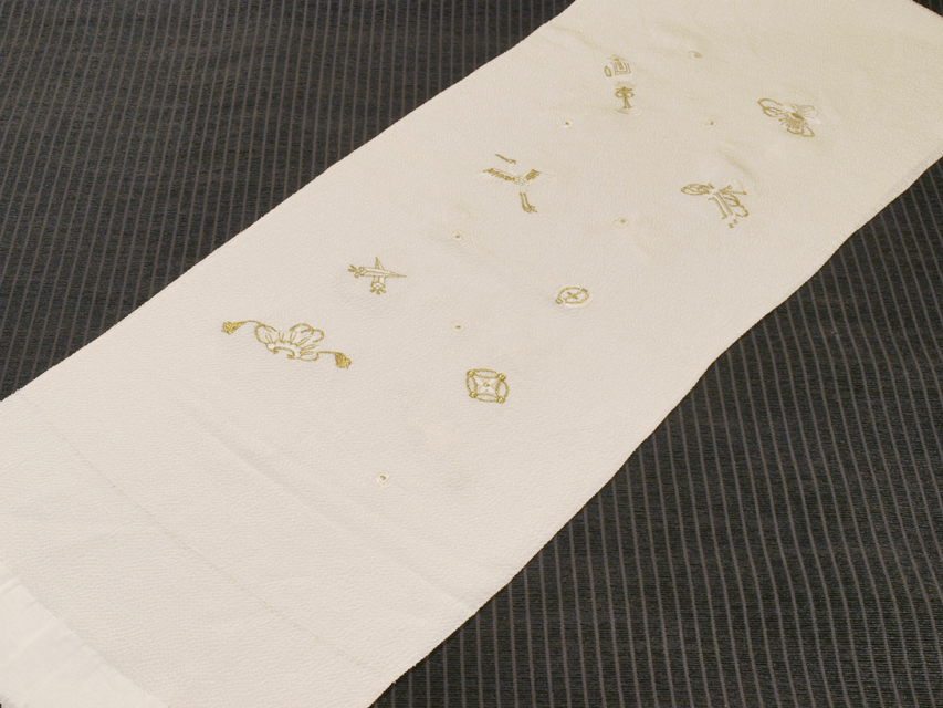 きなり色の地に、刺繍で宝尽くしの文様が施されている、鬼シボ縮緬の帯揚げです。 使用感はなく、未使用保管品と思われます。目につくしみやよごれ、褪色などのダメージもなく、ほぼ新品同様にきれいです。※画像は 2 つ折にしています。 |