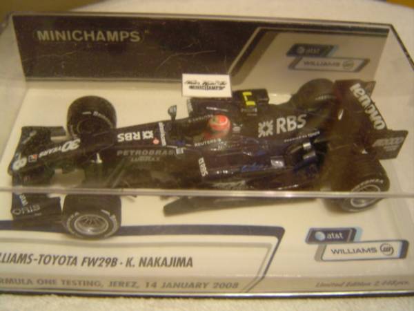 ミニチャンプス製、2008年1月14日へレステスト仕様のウィリアムズトヨタFW29B、中嶋一貴のモデルカーです。ケース、本体ともに美品です。2,448台限定。ミニカーは大量生産品のため、デカール等個体差が生じてしまうことをご理解のうえ入札願います。完全品をご希望の方は、入札をご遠慮ください。ゆうパックにて発送します。東京都内700円、東北・関東(東京都以外)・信越・北陸・東海は760円、近畿は870円、中国・四国は1,030円、北海道・九州は1,290円、沖縄は1,330円となります。まとめて落札いただいた場合は、別途連絡します。