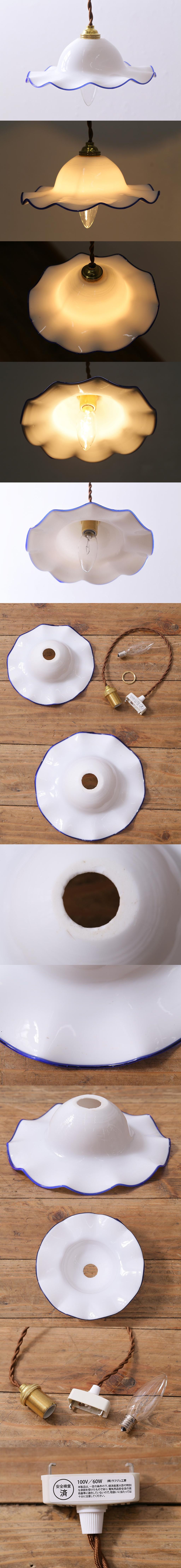 R-039918 ヴィンテージ照明 イギリスビンテージ 縁の青いフリルが爽やかなミルクガラスペンダントライト(ランプシェード、天井照明)