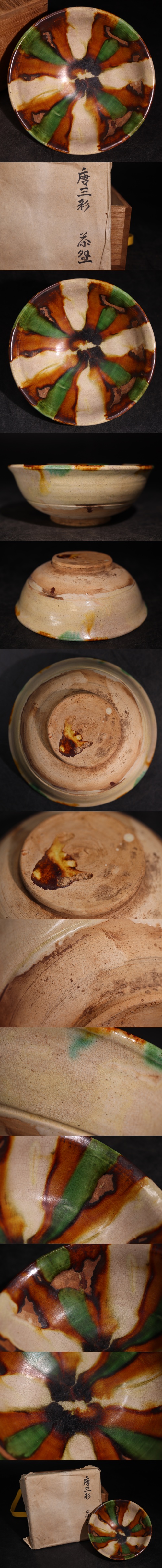 | 時代 唐三彩 茶碗 木箱付 / 中国美術 三彩 茶器 煎茶道具 検索: 唐 .G3919 |
