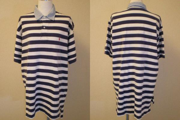 当方のオークションをご覧いただきありがとうございます。ラルフローレンのポロシャツです。100%コットンで鹿の子地になります。襟部分はシャンブレー地になっています。カラーはネイビーとホワイトのボーダーになります。サイズはLで実寸は着丈(襟の付け根から)80センチ、身幅60センチ、肩幅49センチです。コンディションは着用感はありますが破れなどのダメージはありません。