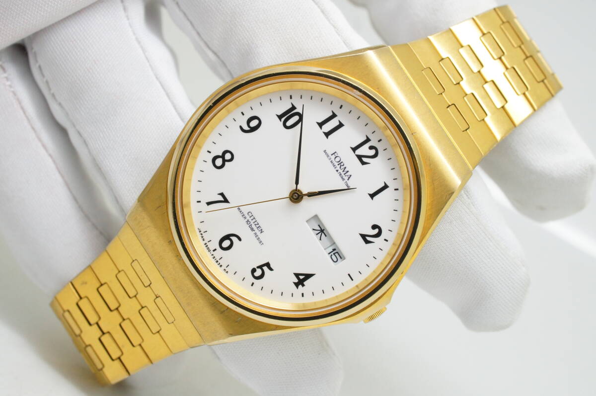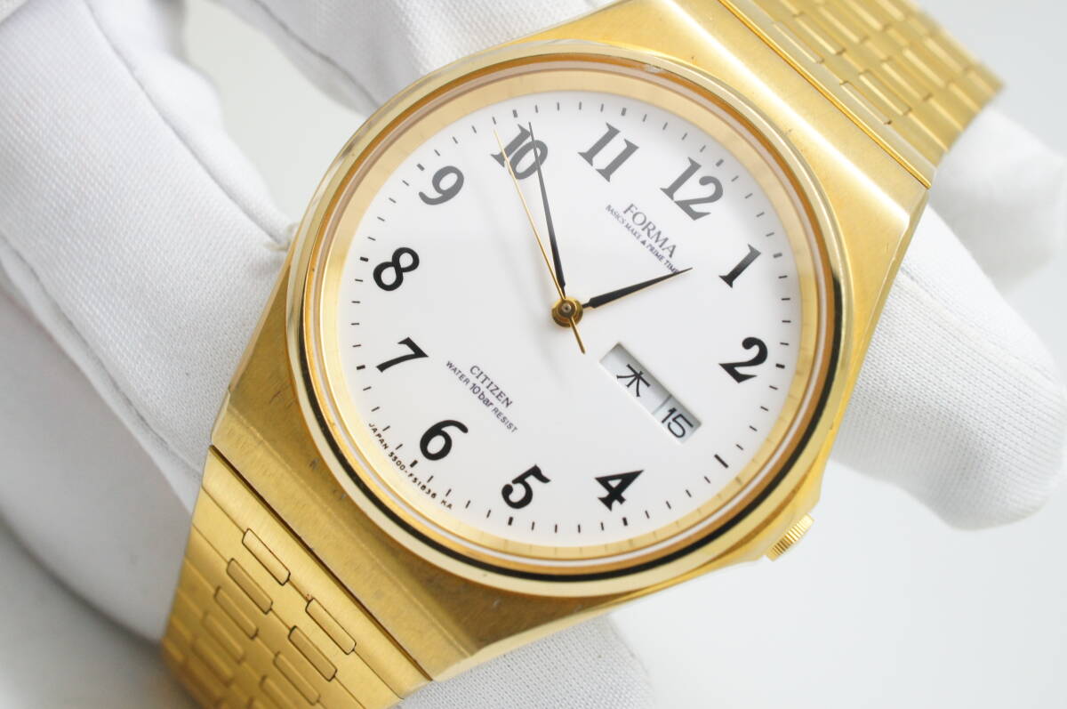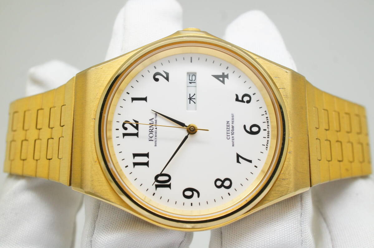 J102●作動良好 CITIZEN シチズン FORMA 5500-F50093 白文字盤 ラウンドケース型 デイデイト メンズ腕時計 ゴールド金 お洒落 クォーツ