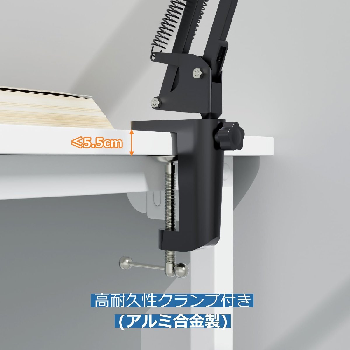 【強力な金属製クランプ・省スペース化】金属製ボディに加えて、肝心なクランプ部分も頑丈で耐久性のあるアルミ合金製です。厚さ5.5センチ以下のどんな場所にも気軽にしっかり固定できるクランプ設計で、角度の調整も安定しています。取り付けはとても簡単で、工具が一切必要ありません。クランプの設計により、デスク上での大幅なスペース効率化を実現します。