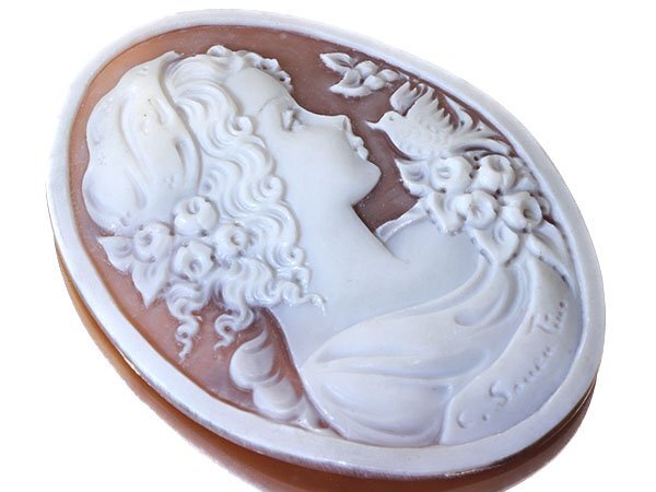 素敵な女性と小鳥を繊細に彫刻で演出した、素晴らしい高級シェルカメオルースです!