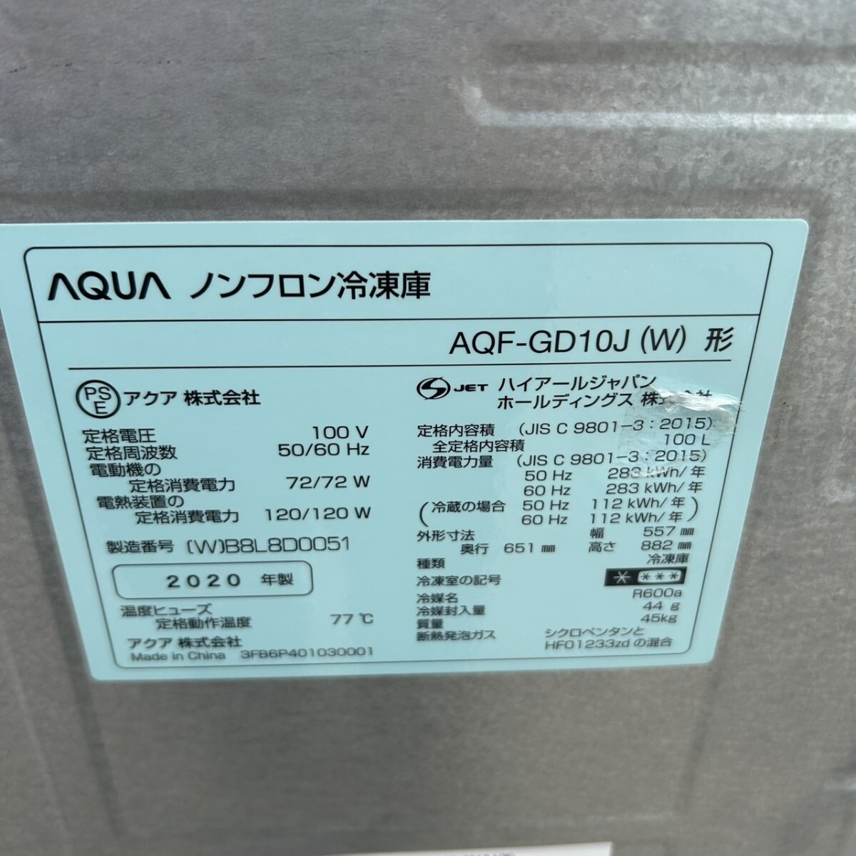 美品! AQUA アクア AQF-GD10J ファン式 冷凍庫 2020年製 クリスタルホワイト 100L 2ドア 引き出しタイプ