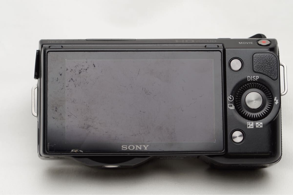 また、写真のとおりNEX-5の液晶画面には破損があります。こちらは、画面が映ってしまえば気にならないと思います。(よく見えないかもしれませんが、細いひびが画面が映る範囲にもかかってます)