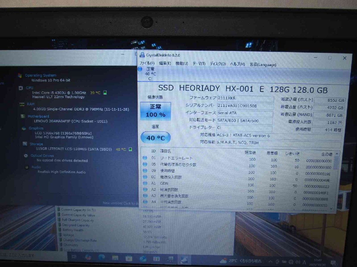 | バッテリー状態 | 新品時と比較して 58% の性能。 (BatteryInfoViewで表示された参考値であり実際の容量・充電可否は保証対象外) |