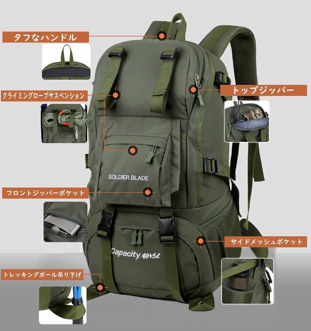 【商品状態】未使用【素材】ナイロン、ポリエステル【カラー】グリーン【サイズ】 約32* 50*18cm【容量】55L通気性、防水性、抗菌性アウトドアに最適な55L防撥水登山リュックです。背中に当たる部分は通気性に優れたメッシュ・クッションの構造です。防撥水600Dオックスフォー