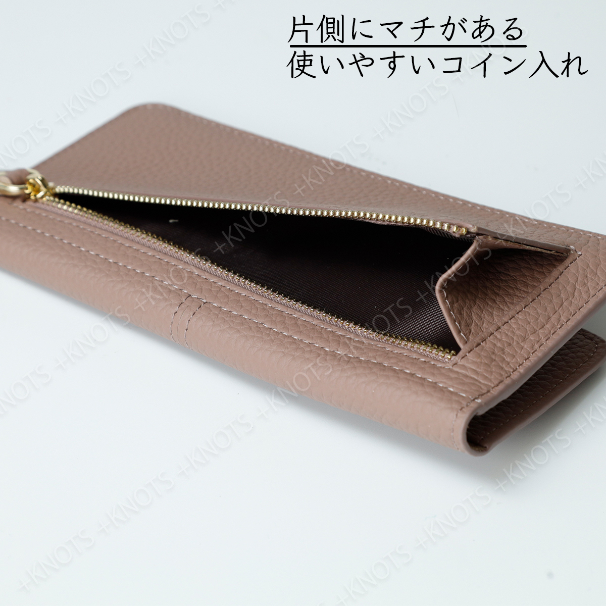 やわらかめ本革を使用したソフトな質感の長財布です。フラップタイプのシンプルな構造なのでアクセスががとてもスムーズ。背面のファスナー付きのポケットが大きく開き、小銭はは財布を開かずに出し入れできます。薄いロングウォレットはバッグの中でもかさばらず、お札も折らずに収納できます。幅広い年代の方におすすめです。