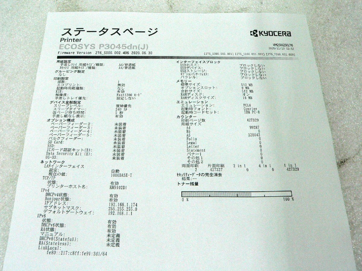 | 状態 | テスト印刷良好です。使用枚数 427,329枚、トナー残 60%。 |
