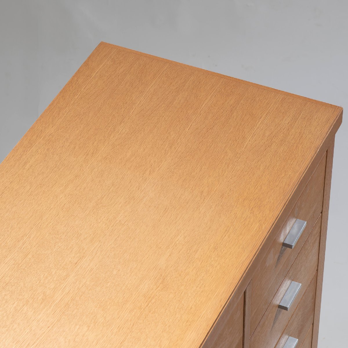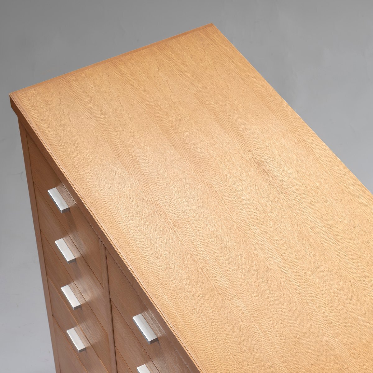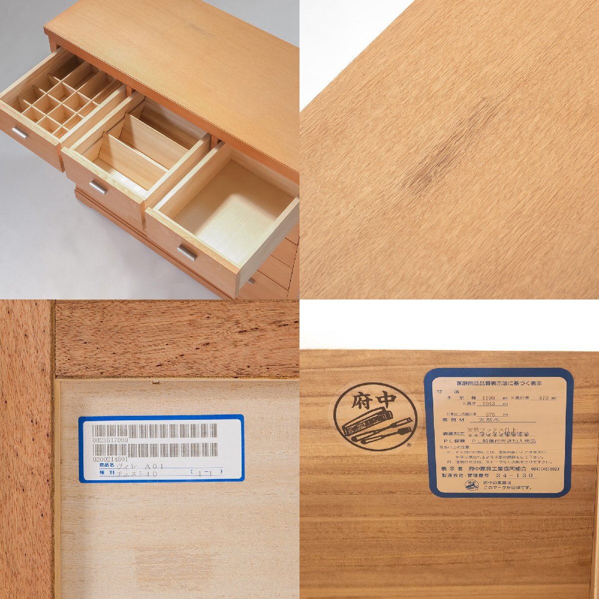 こちらは府中家具の多段チェスト。外装には堅牢で美しい木目を持つオーク材突板を、内部には湿気を防ぎ収納に最適な桐材を使用しています。