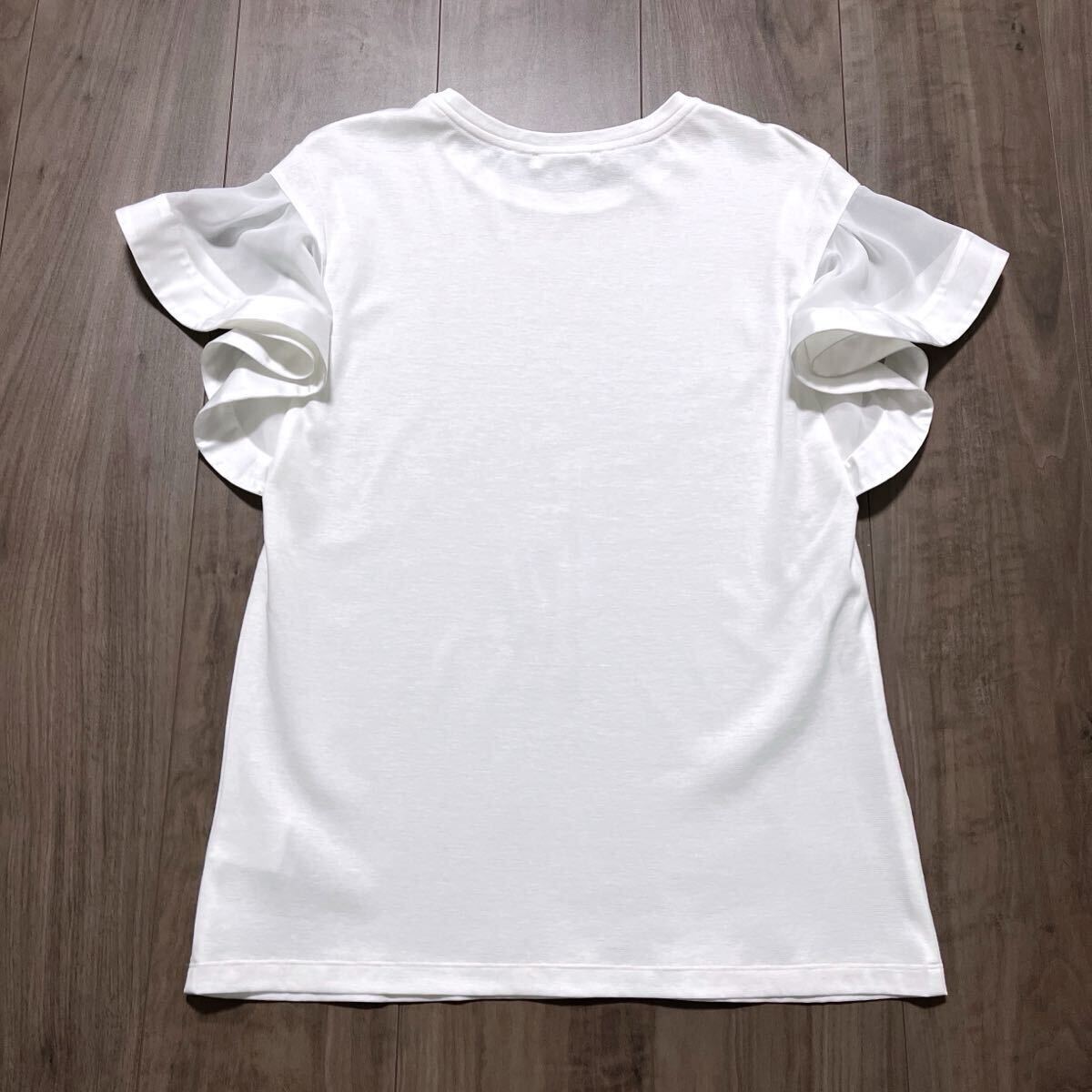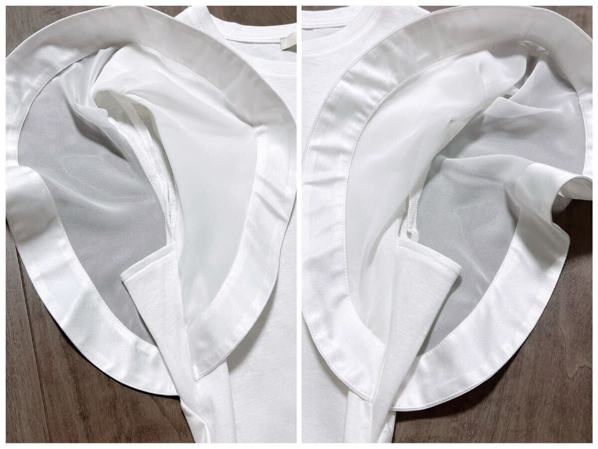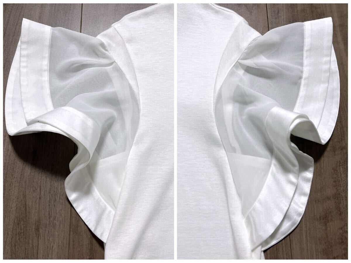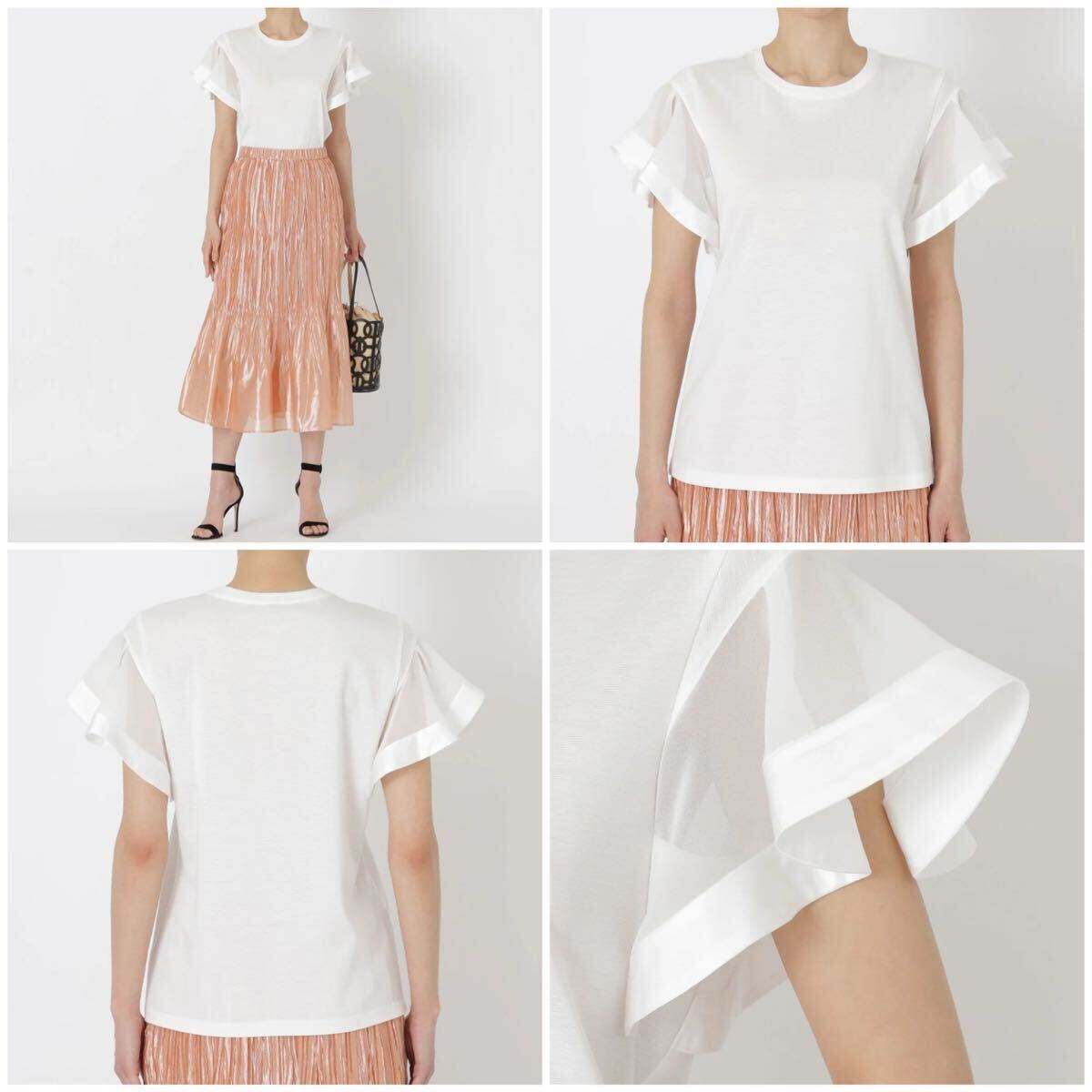 フリルデザインが華やかなカットソーです。甘くなりやすいフリルデザインも、シアー素材をコンビさせることで、大人のエレガントな印象を引き出します。単品はもちろん、袖デザインがポイントなのでジレとレイヤードさせた着こなしにも活躍します。