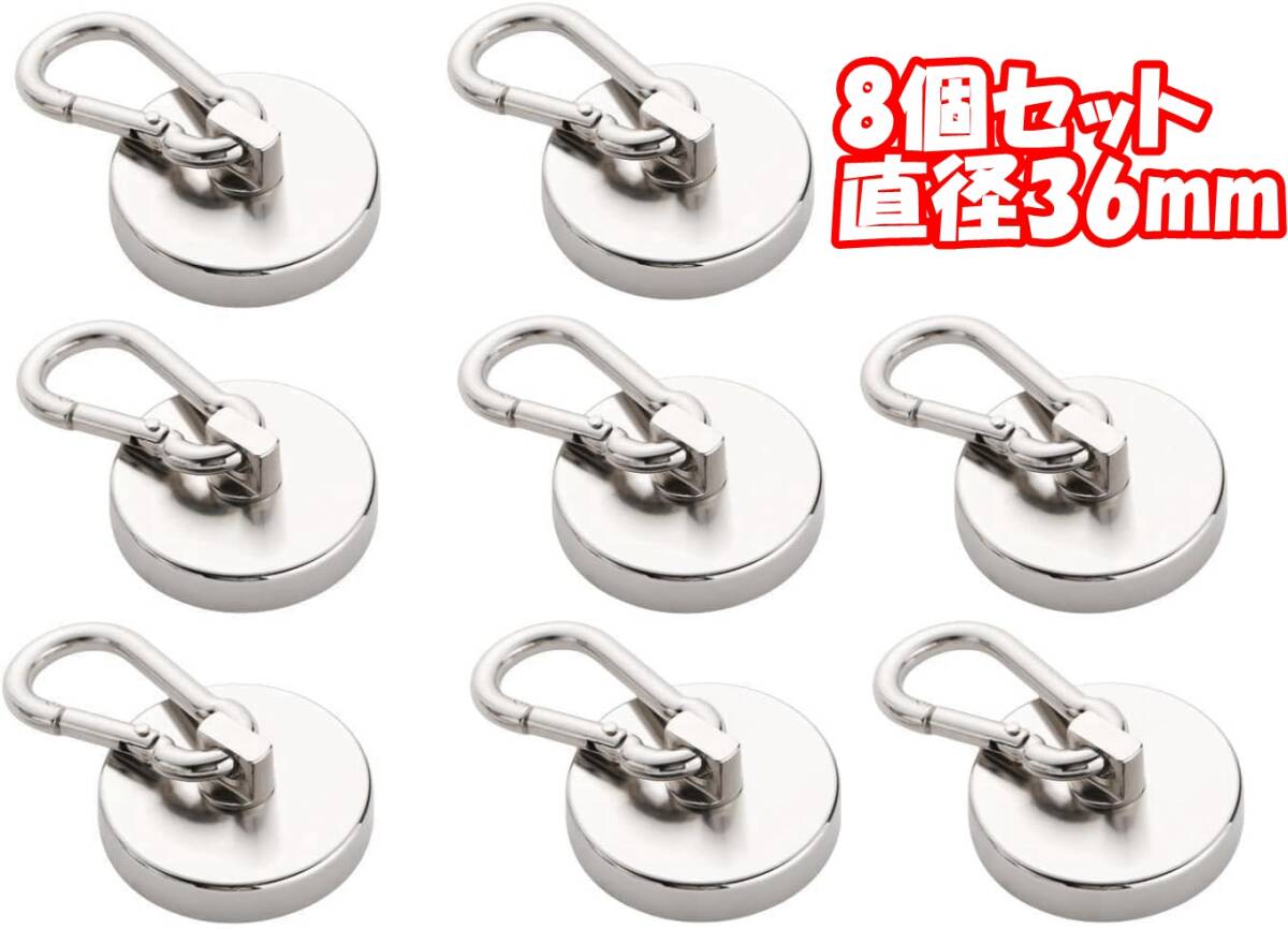 【8個-直径36mm】カラビナ付き磁石 超強力磁石 マグネットフック ネオジム磁石 ステンレス製 防錆