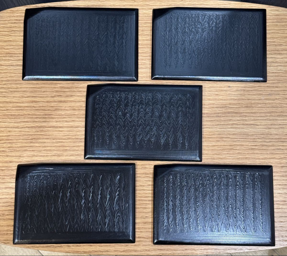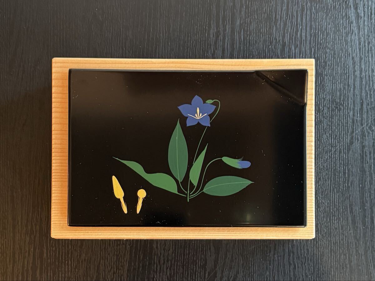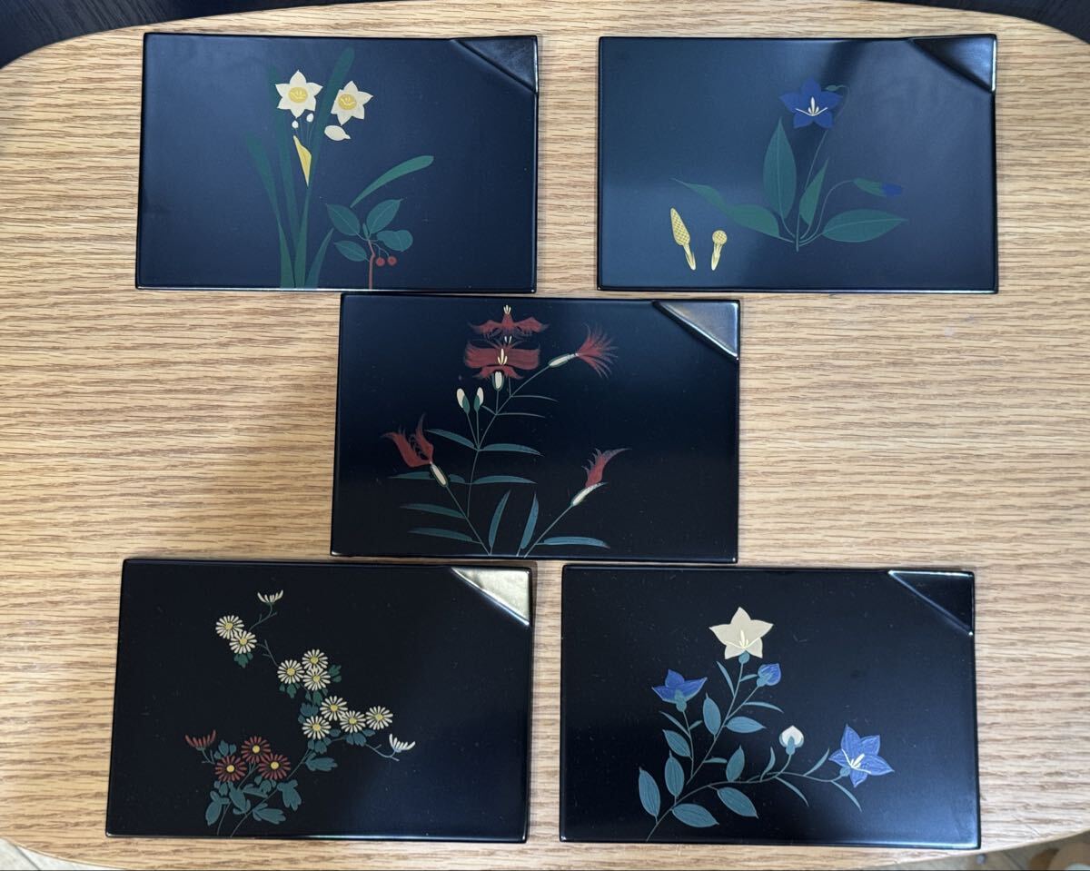 季節の花々を描いた沈金蒔絵風の長角銘々皿、5枚揃いです。