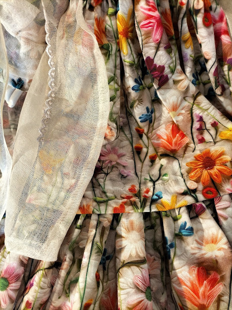 *オータムカラーの草花模様ドレスは後全開、マイタック、前フリル4段 アンティークレースの襟。