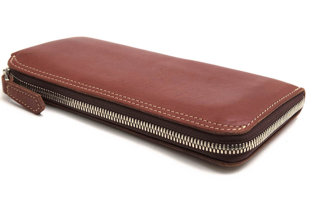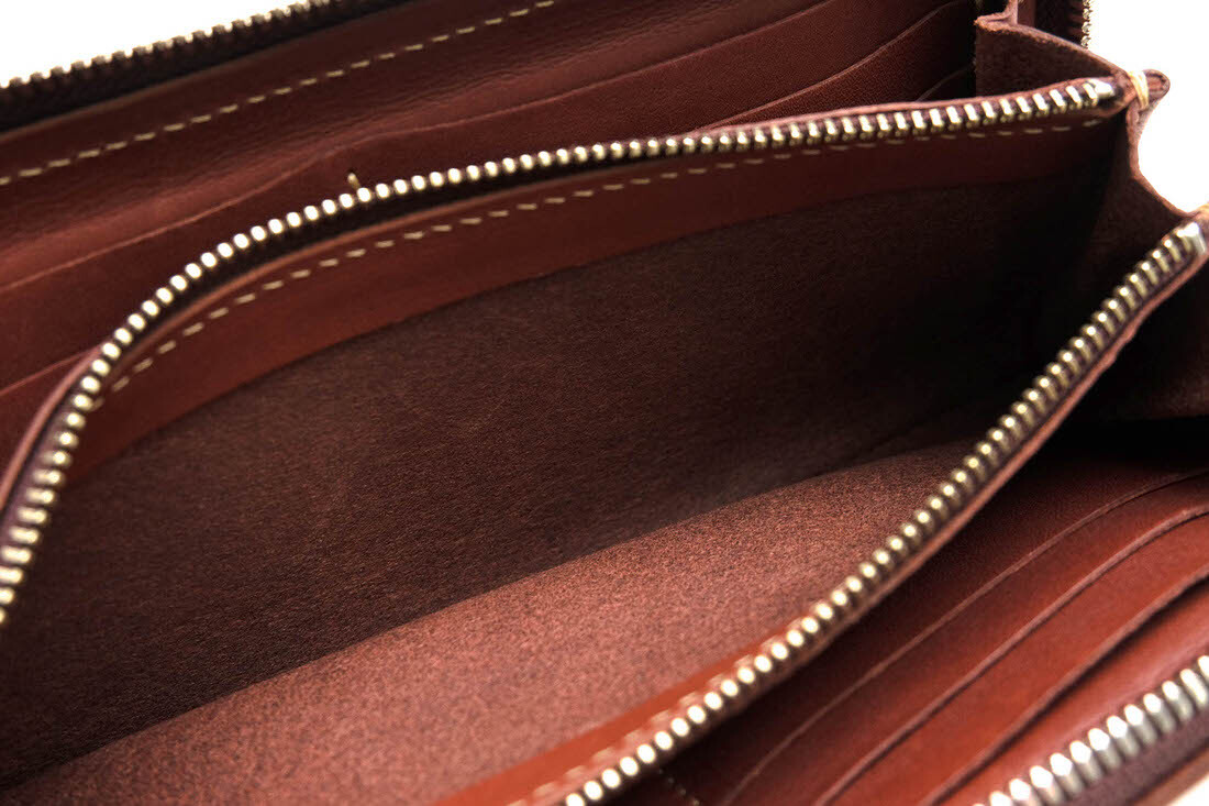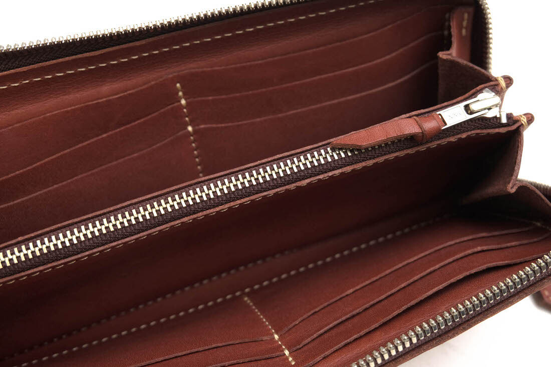 | スマートで、より使いやすくリデザインしたPAILOT RIVERの「L Zip Round Style Long Wallet」。フルオープンせずとも片手でスムーズに開閉できる操作性が魅力で、収納力とセキュリティ性を損なわず、快適な使用感を実現しています。素材には、REDMOONが誇るサドルレザーを採用。ステアハイドを植物タンニンで丹念になめしたこの革は、長期間の使用で飴色に変化し、持ち主ごとの個性が刻まれていくエイジングが楽しめます。内装は、すべて本革仕立て。職人の手仕事により、12枚のカードスロットや複数の仕切りを絶妙なバランスで配置し、必要最小限の構造でありながら高い収納力を備えています。信頼性の高いYKK製ジップ、蛇腹構造のマチ、丁寧に縫製された各部の仕上げからも、メイド・イン・ジャパンの誇りが随所に感じられます |