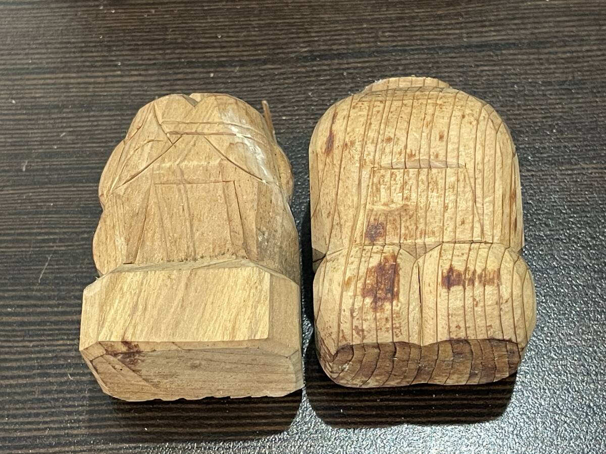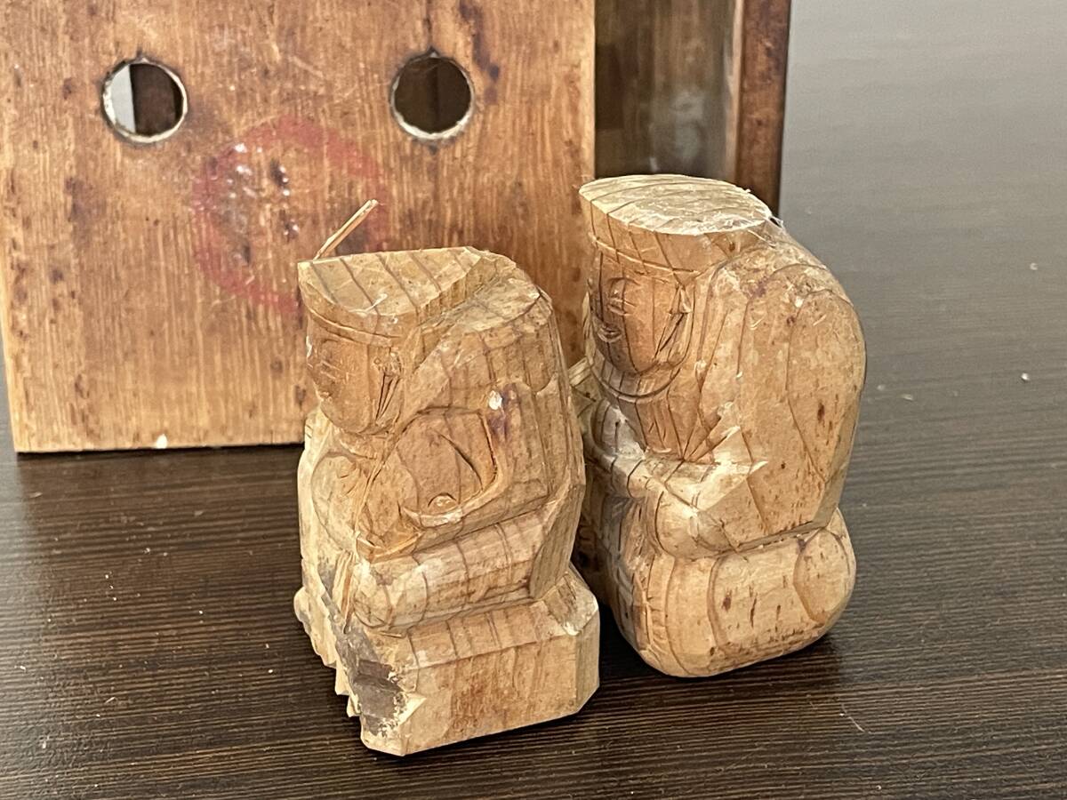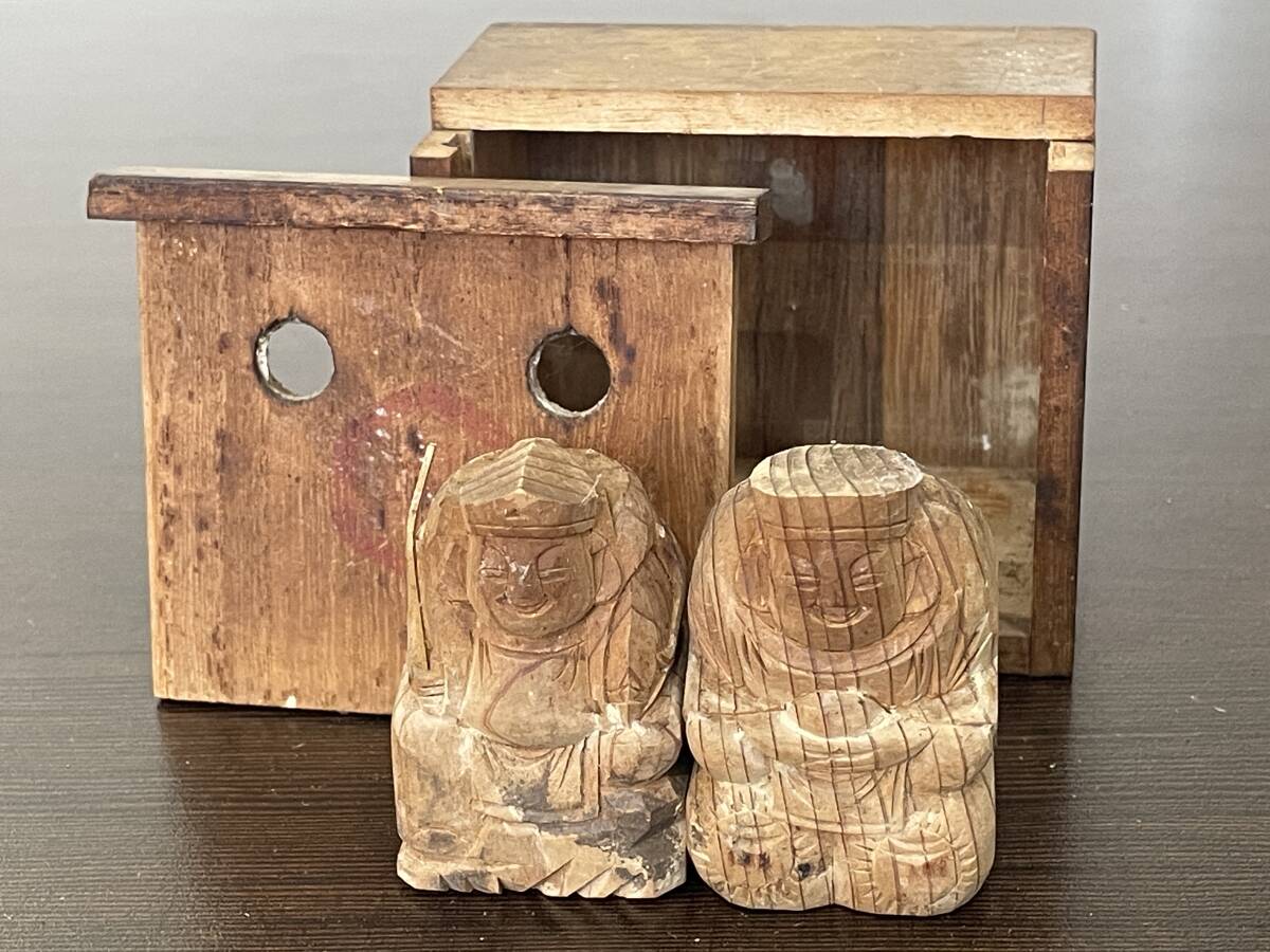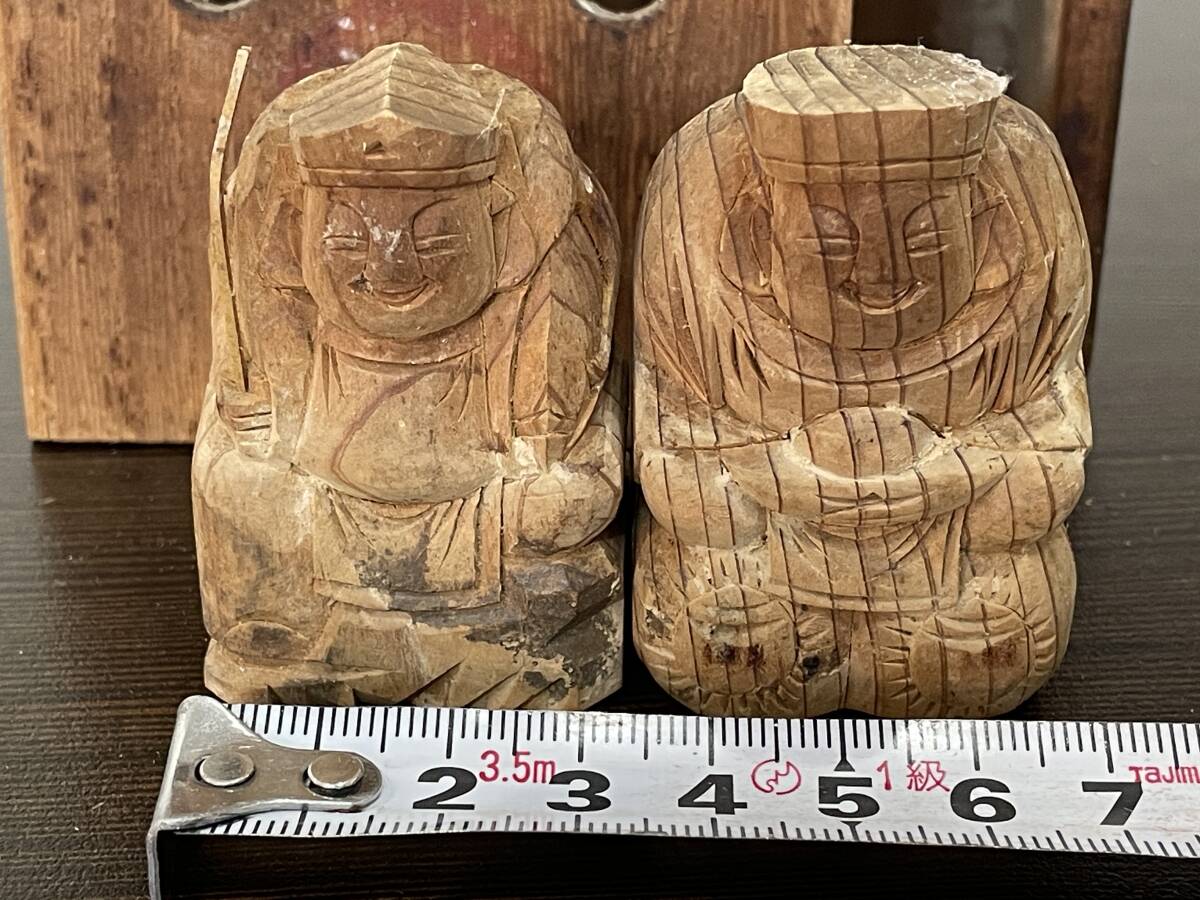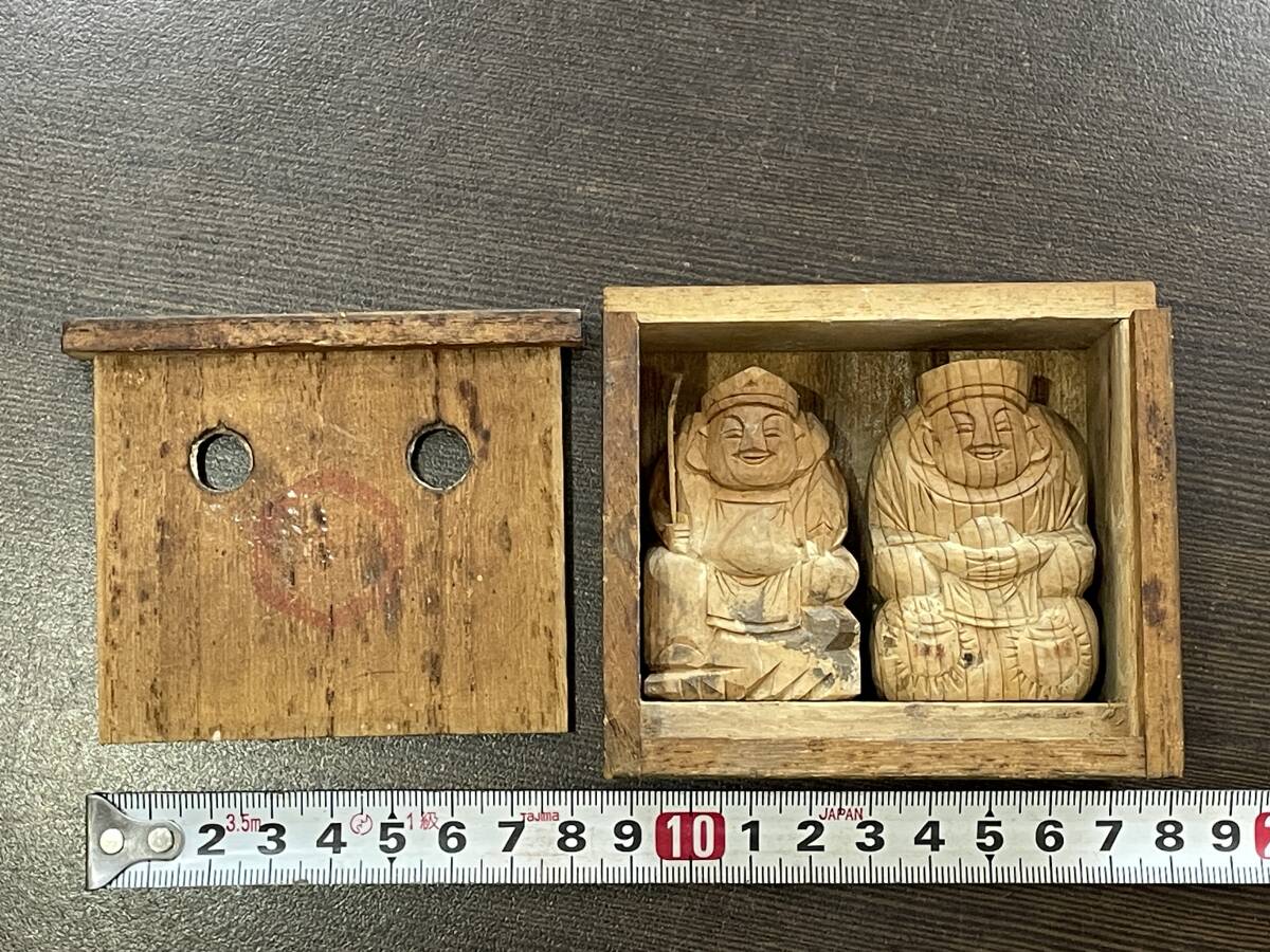 ★【和風 縁起物 開運 インテリア 置物 木製 ミニ人形 小型像】木彫り 七福神 大黒様 / 大黒天 恵比寿様 2体セット★木箱入り