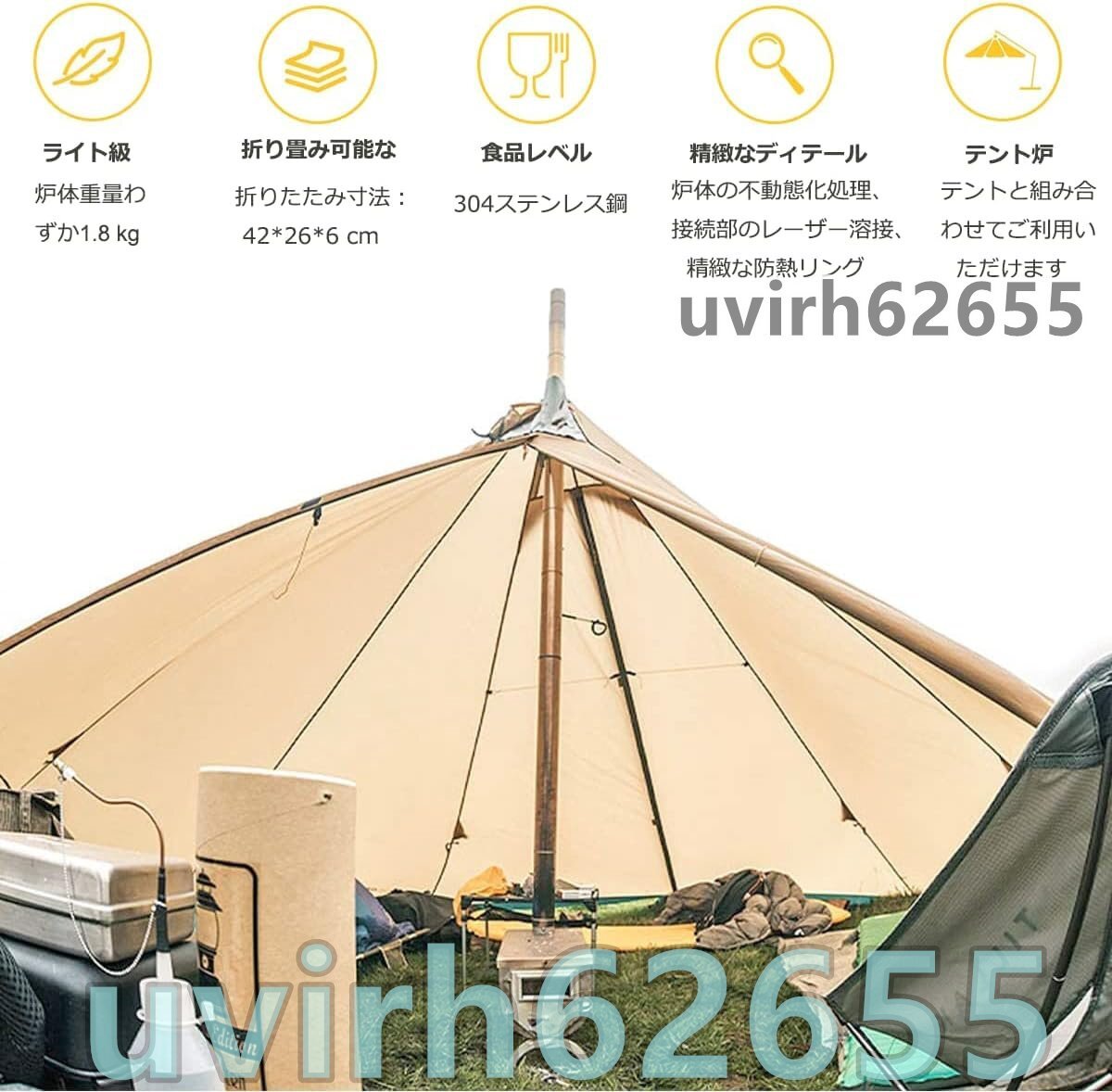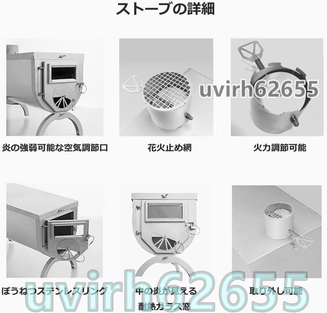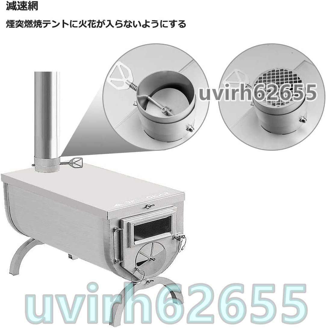 【火力調整可能 & 花火止め網設計】正面にロータリ吸気口がある、炉内の薪の燃焼空気が十分であることを確保でき、そして炉門の吸気弁と炉頂回転ダンパーを制御することによって空気の流通と燃焼効率を制御することができます。最終的には花火の防護ネットが取り付けられた煙突の口から煙を排出させ、花火の防護ネットの設計は高温の火星を濾過することができ、それによってテントを火花でやけどをしないように保護することができる。