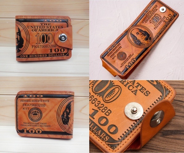新品未使用 100usドル柄財布 ブラウン レザー財布フォトカードホルダー 二つ折り財布 メンズPUレザーウォレット 送料無料