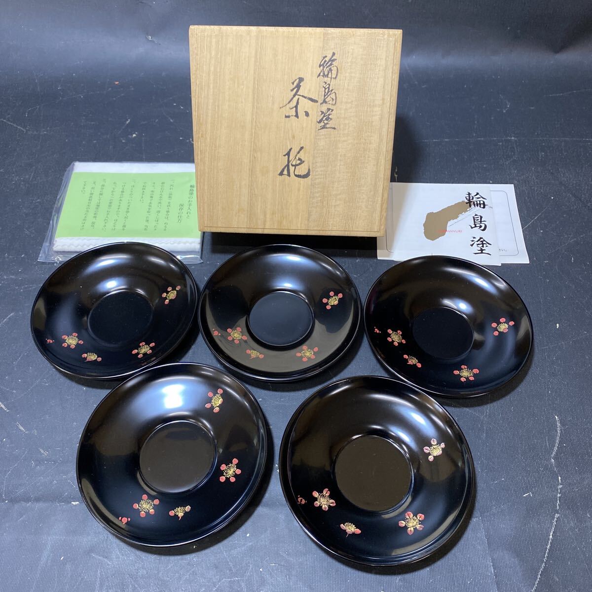 N 6661 [ 輪島塗 茶托 5客セット!] こぼれ梅 銘々皿 木箱入り 供箱 漆黒 沈金 骨董 蔵出し 保管品 美品 茶道具 煎茶