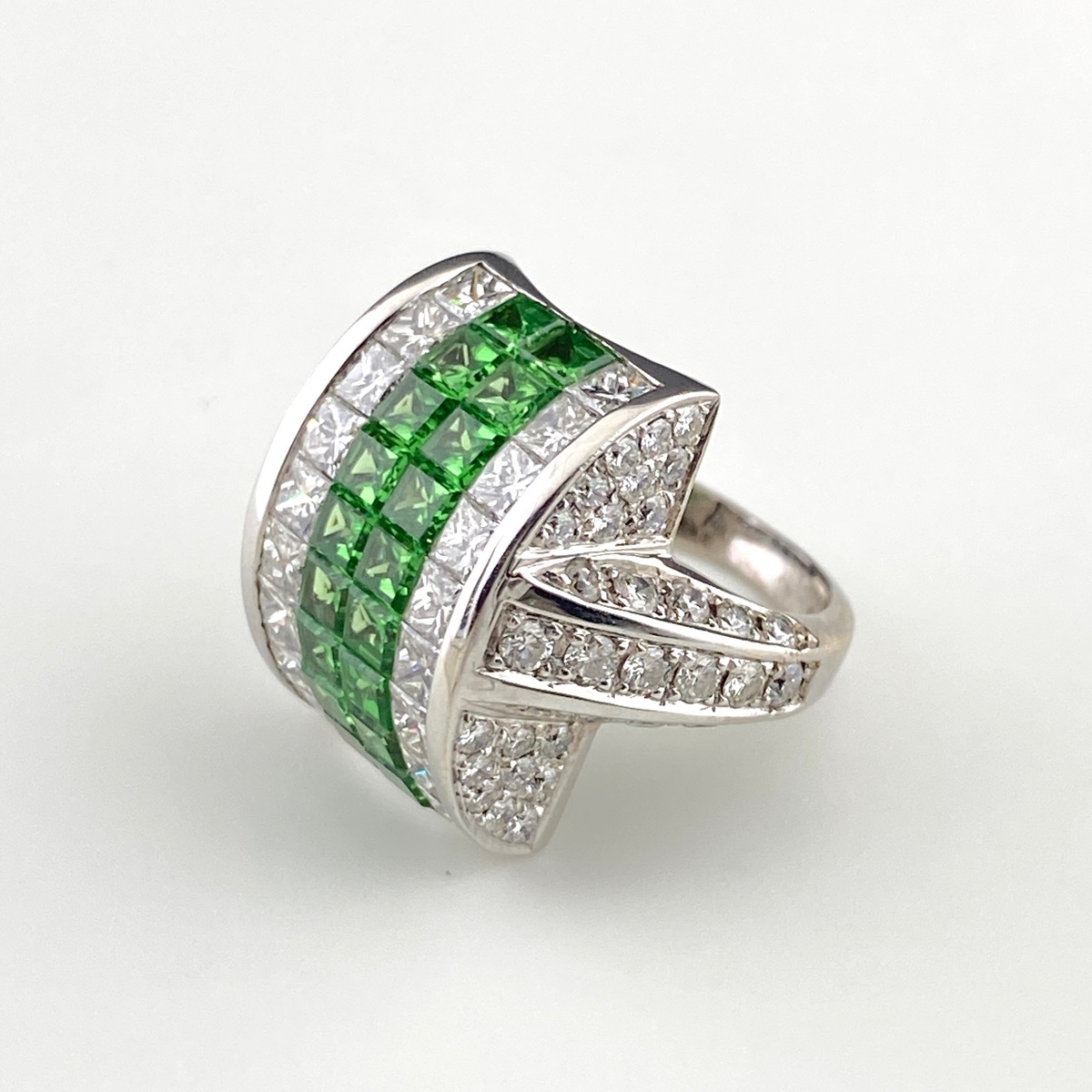 実寸サイズ| 約9号 | リング最大幅 | 約19.7mm | リング最小幅 | 約2.4mm | リング厚さ | 約6.7mm | 素材 | K18、ダイヤモンド、グリーングロッシュラーガーネット | コメント | グリーングロッシュラーガーネット:2.40ct、メレダイヤ:3.35ct | 中古品の為、若干のキズや汚れがございます。 付属品 | 鑑別書 | |